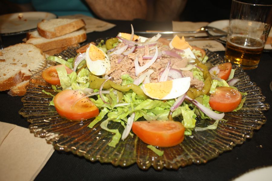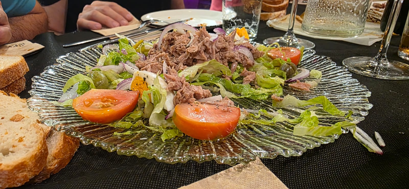 La ensalada —lechuga, tomate, guindilla, huevo duro, cebolla y atún— fue el preludio del plato fuerte: bandejas generosas de tomate frito, pisto, pimientos, huevos fritos con puntilla y pescado fresco, todo servido con la naturalidad de quien sabe que la abundancia es un acto de amor.