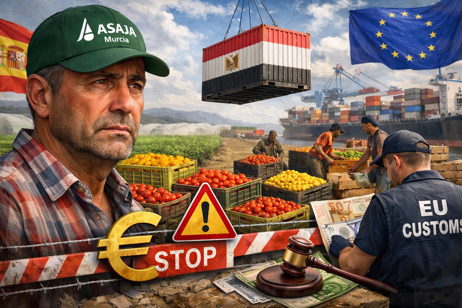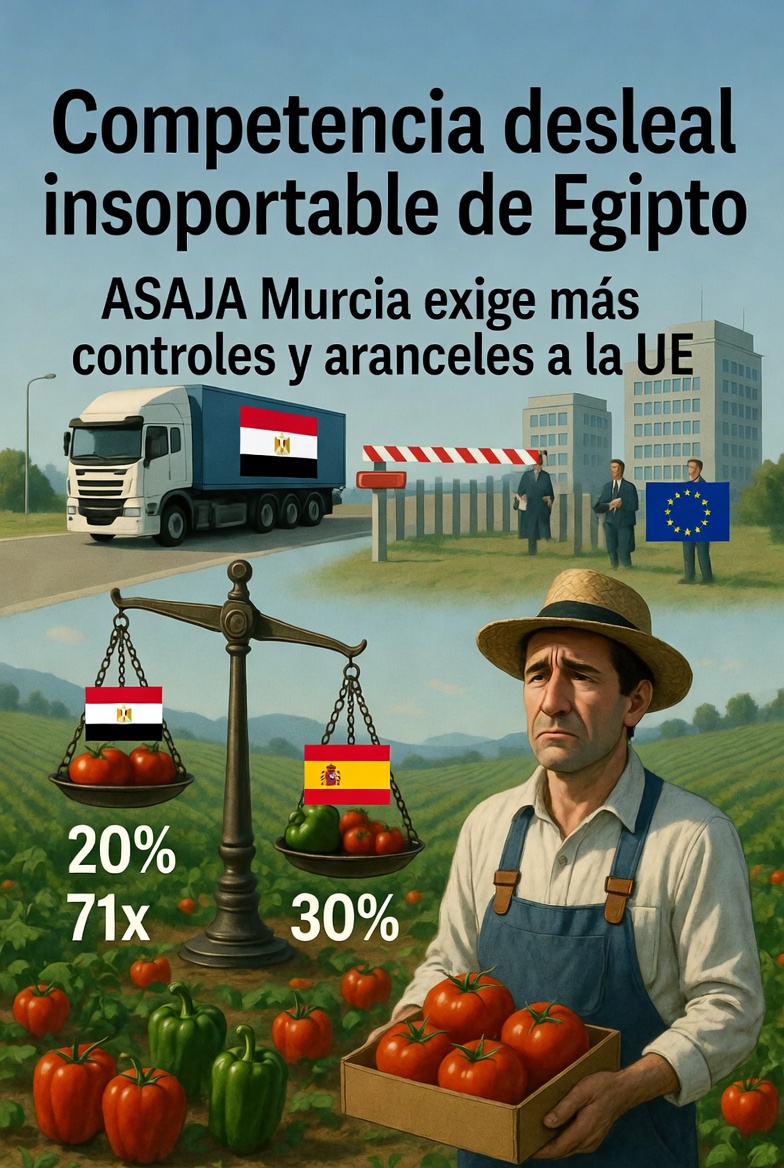La organización profesional agraria ASAJA Murcia ha denunciado públicamente la situación de “competencia totalmente desleal” que, según afirma, ejercen las importaciones procedentes de Egipto en el mercado europeo de frutas y hortalizas, afectando de forma directa a la rentabilidad y viabilidad de las explotaciones agrícolas del sureste español.