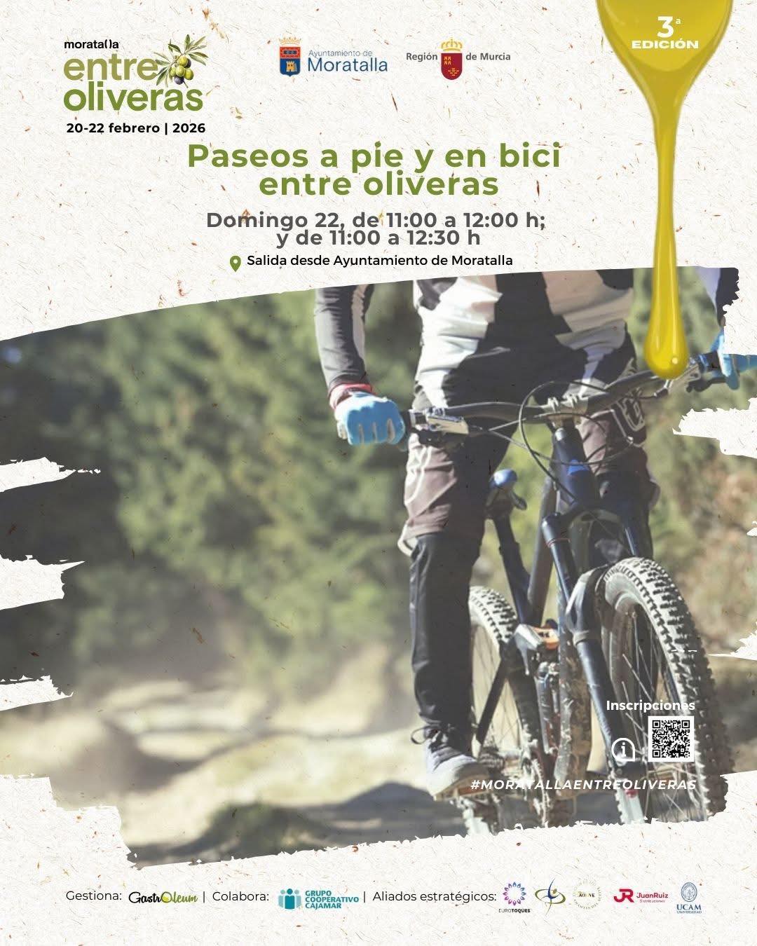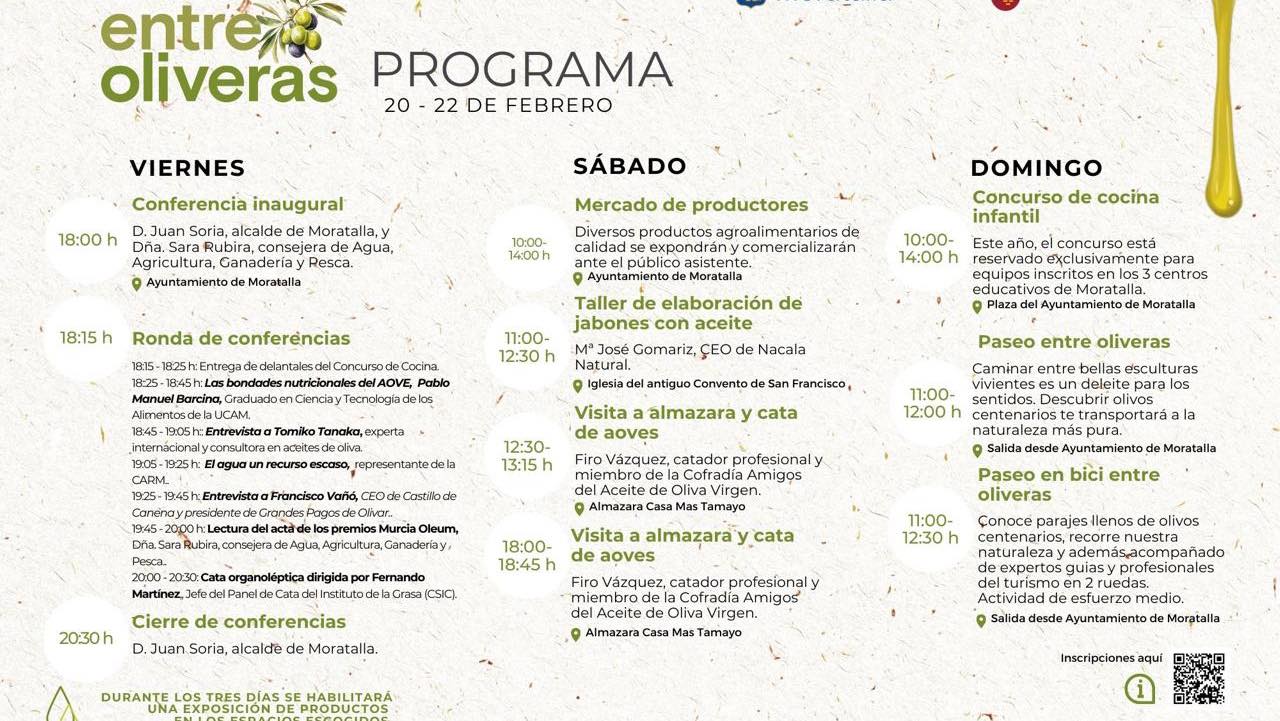 El broche lo pondrá el domingo con dos propuestas que fusionan naturaleza y pedagogía: un concurso de cocina infantil exclusivo para los tres centros educativos de Moratalla —donde los más pequeños demostrarán que el futuro del aceite está en buenas manos— y dos rutas que invitan a perderse entre olivos milenarios. El paseo a pie, de intensidad suave, permitirá contemplar estas «esculturas vivientes» que han sobrevivido siglos de sequías y heladas; la versión en bicicleta, de esfuerzo medio y guiada por profesionales del turismo activo, recorrerá parajes donde el silencio solo lo rompe el crujir de las ramas bajo el viento del Noroeste.