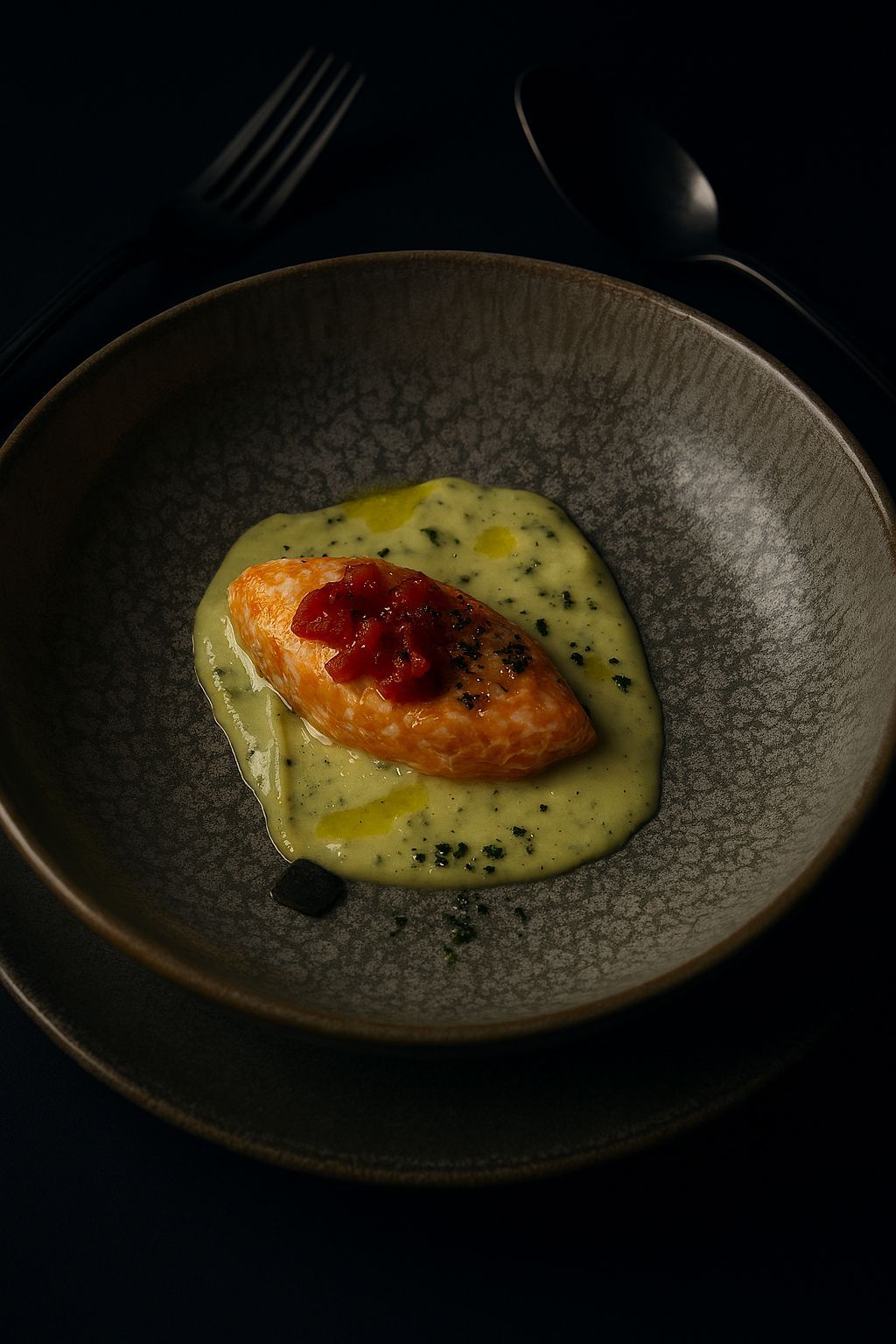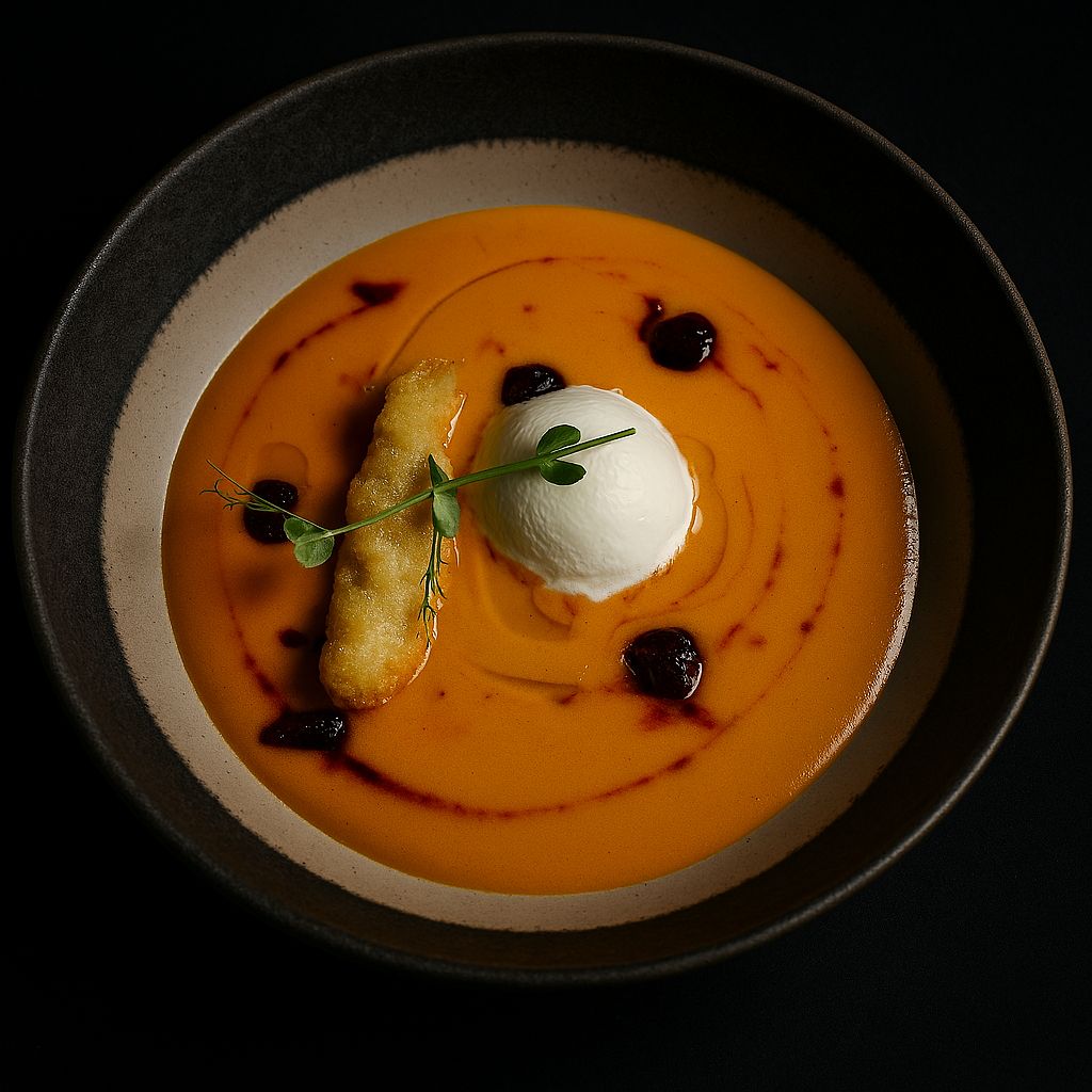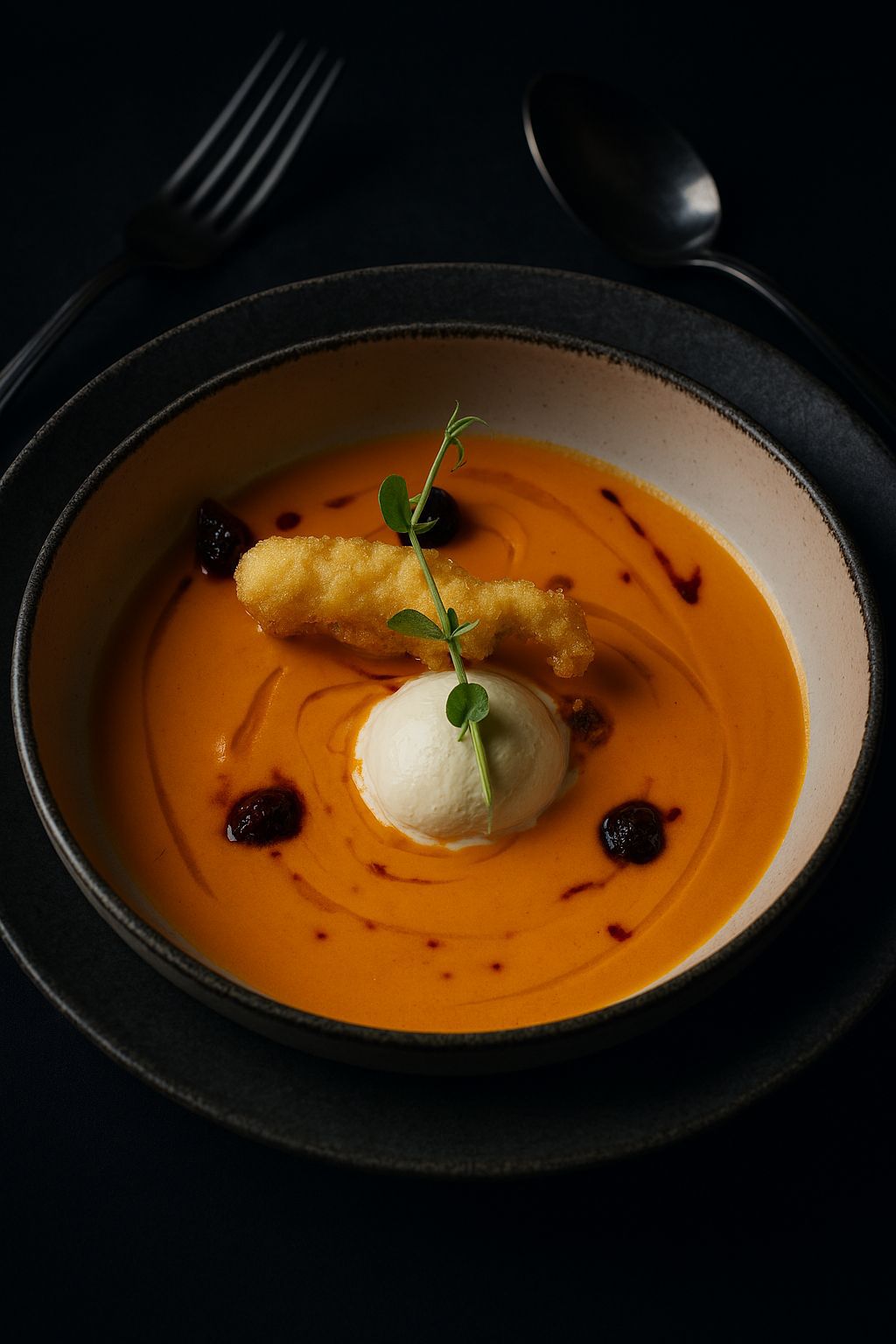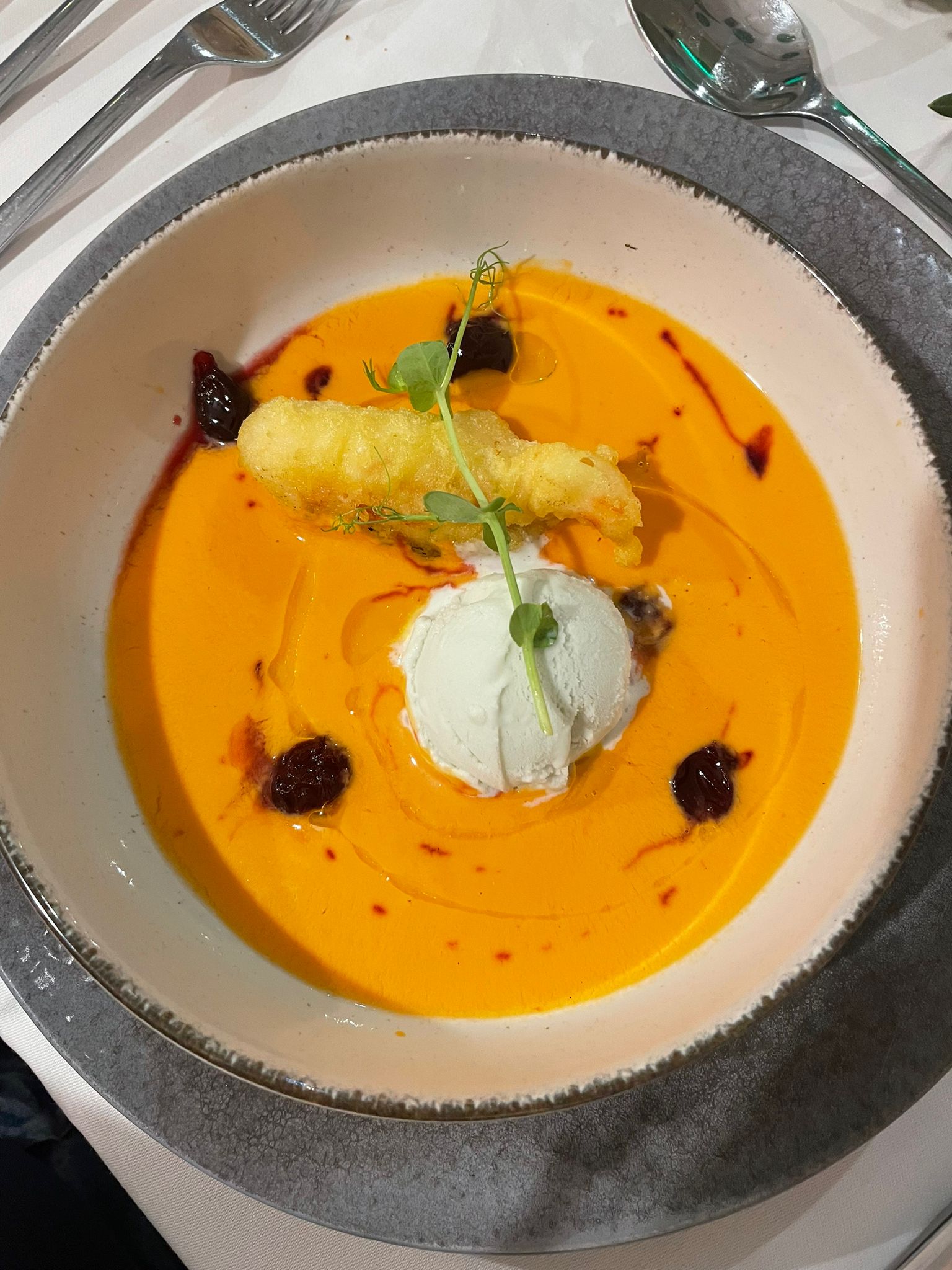 El menú, pensado como un recorrido de siete tiempos, sufrió una interesante variación en el primer plato: el gazpacho de tomate de temporada, cereza, jalapeño, burrata de queso de cabra y langostinos en tempura se sirvió con helado de queso de cabra y langostino en tempura en lugar de la burrata, un guiño creativo que sorprendió agradablemente a los comensales.