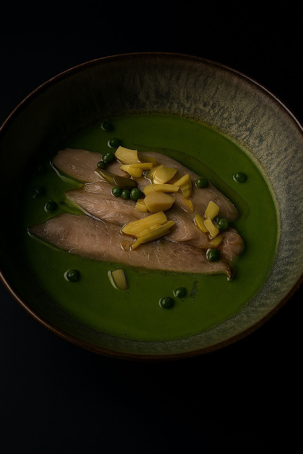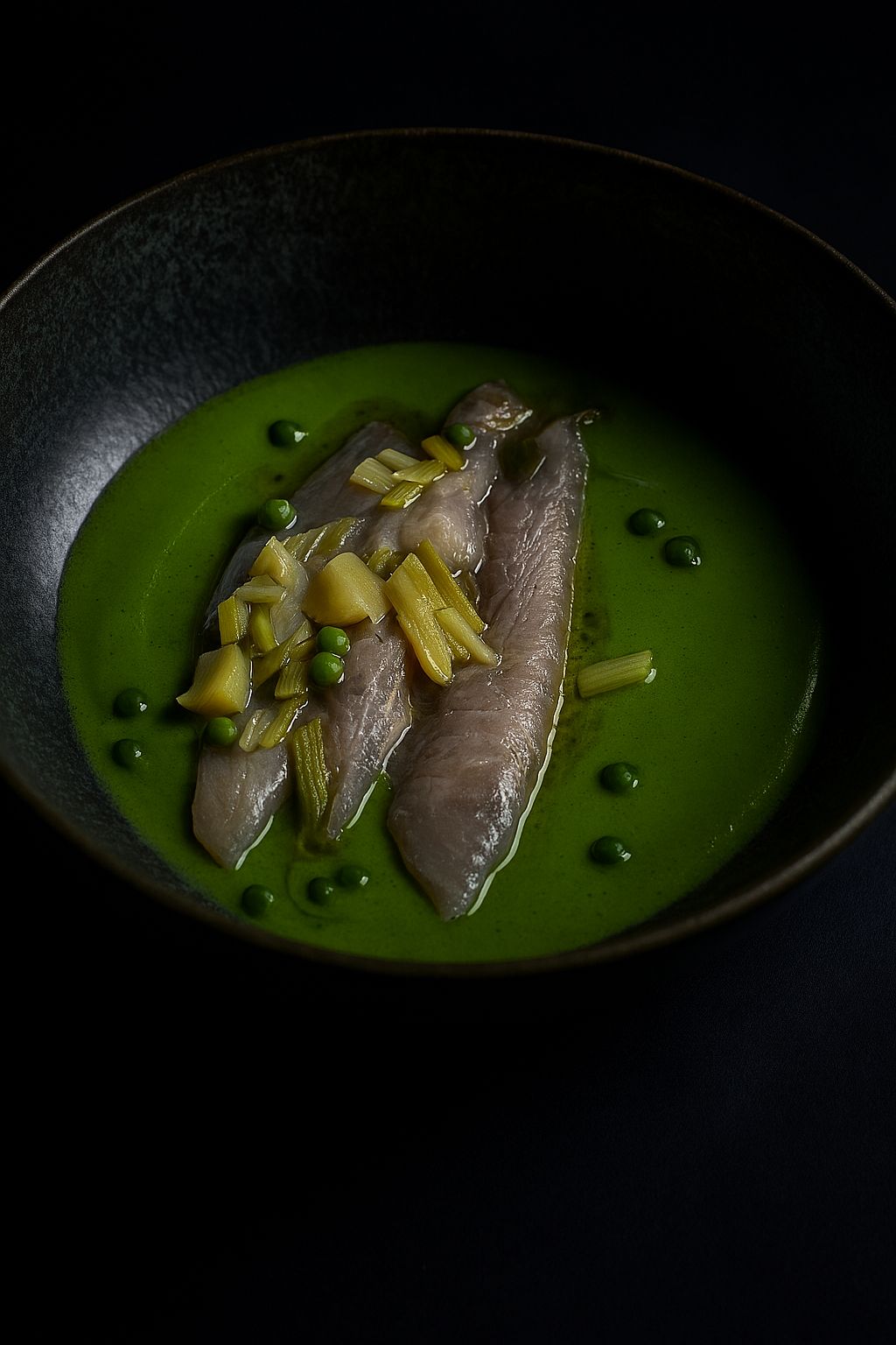 - Salmonetes con guisantes en texturas y ajos tiernos confitados.