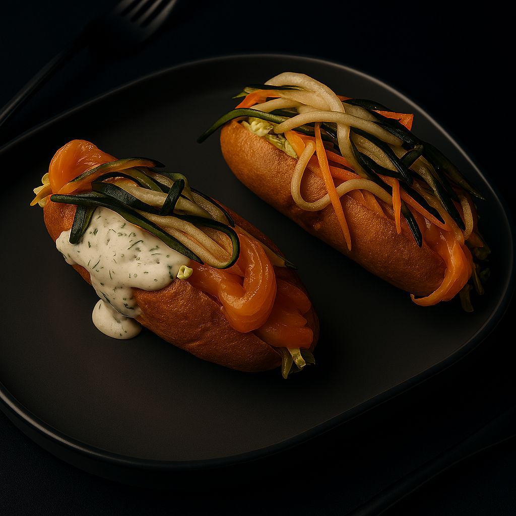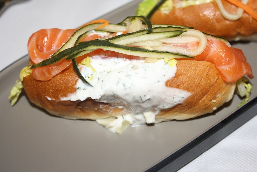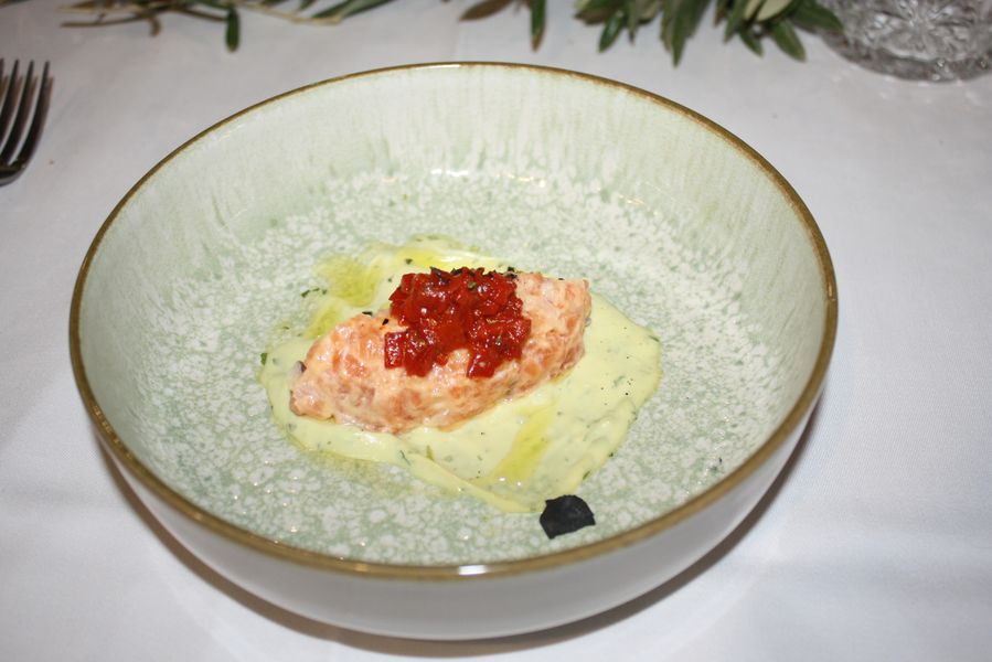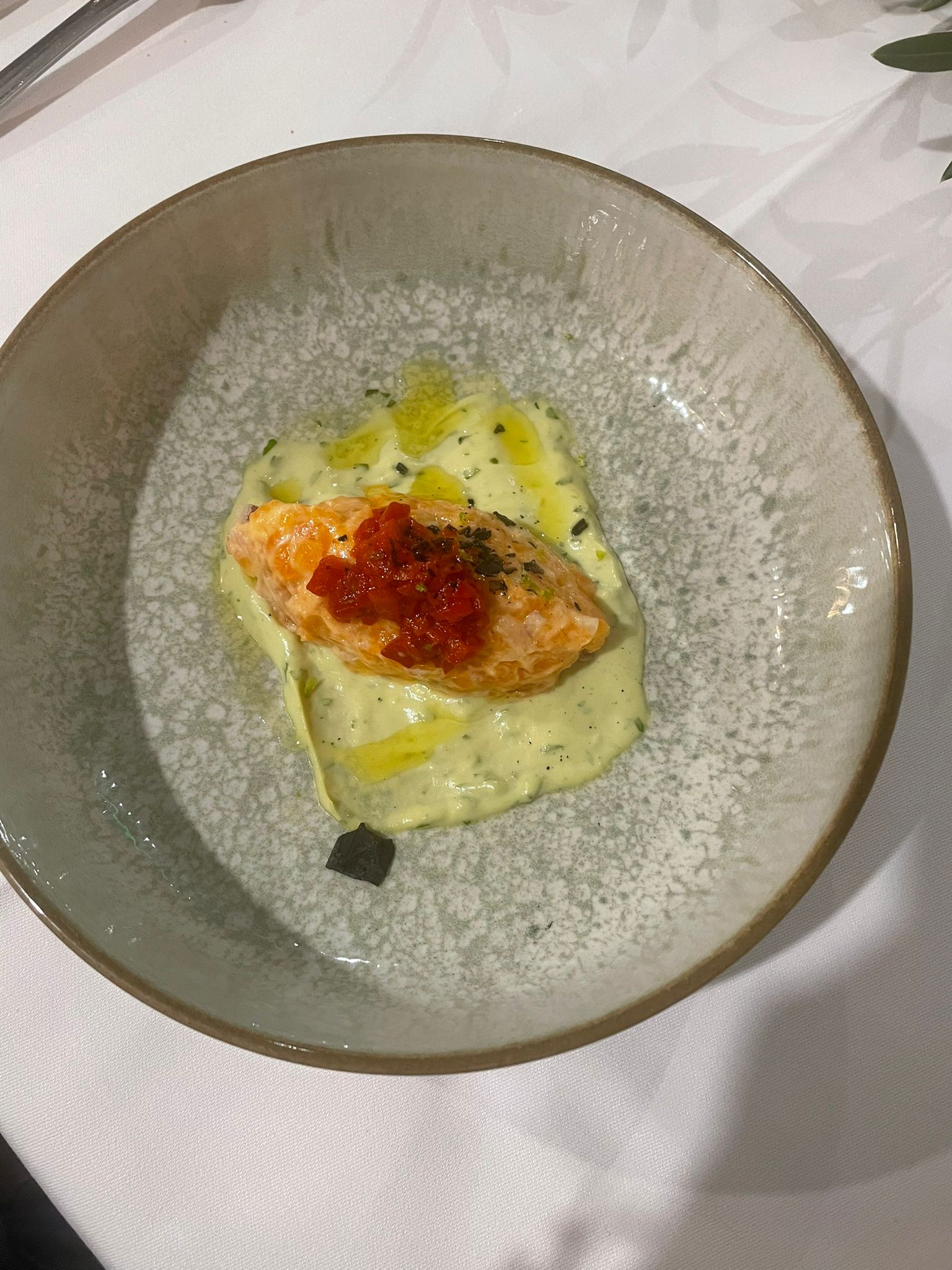 - Tartar de salmón y aguacate, con yogur griego y pan de pita.