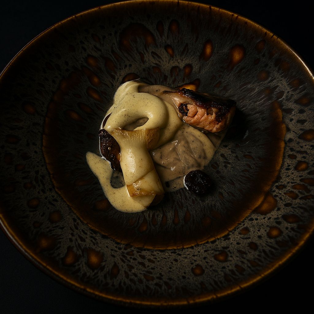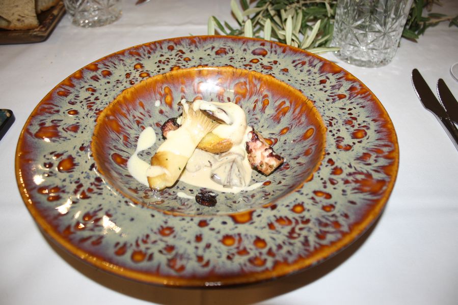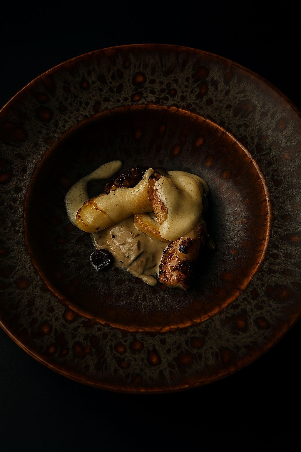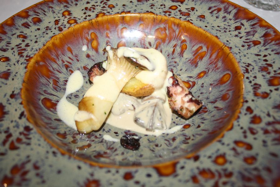 - Taco de pulpo a la brasa con setas teriyaki y sabayón al vino blanco.