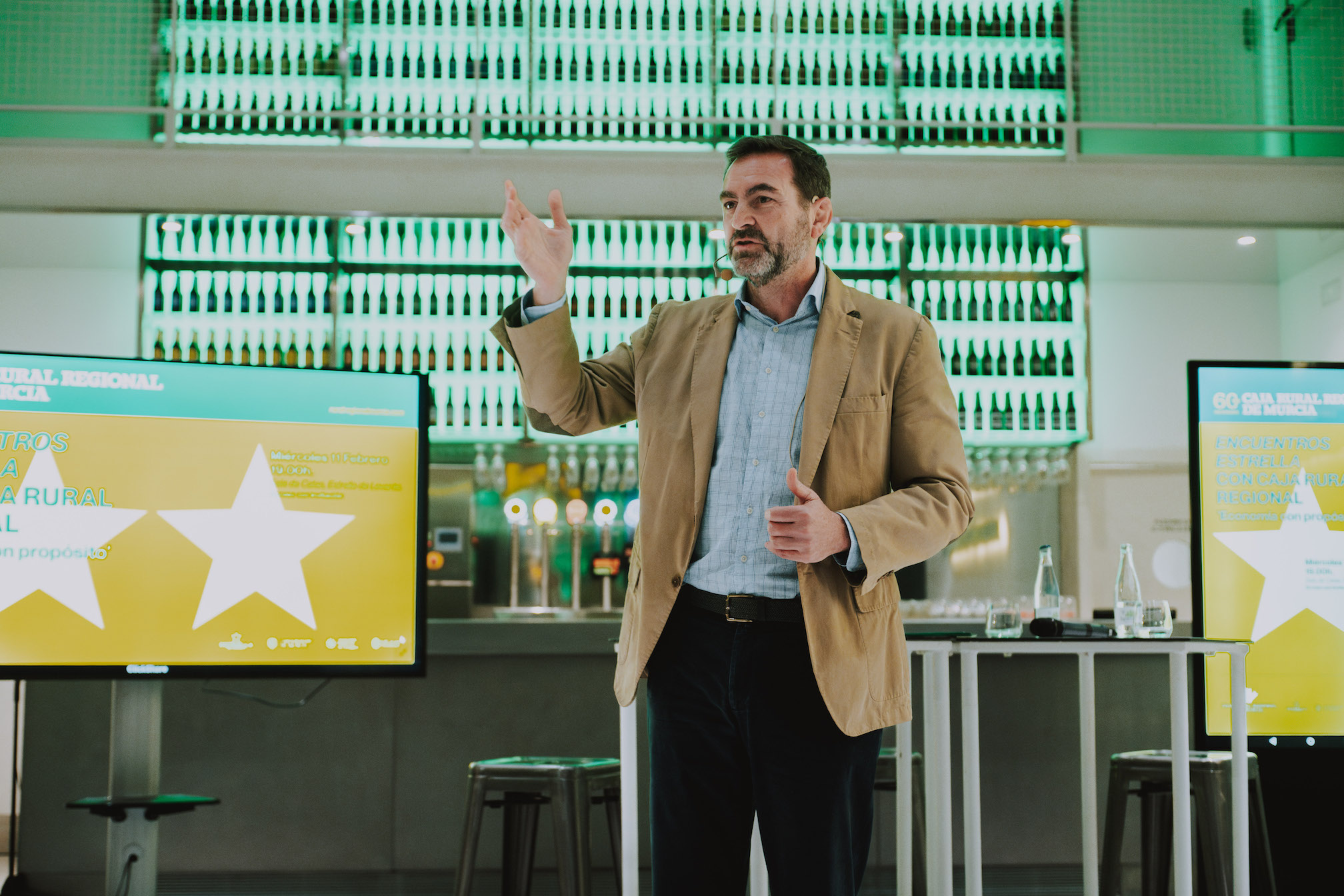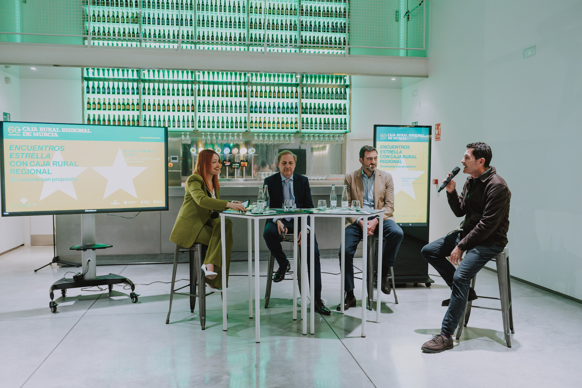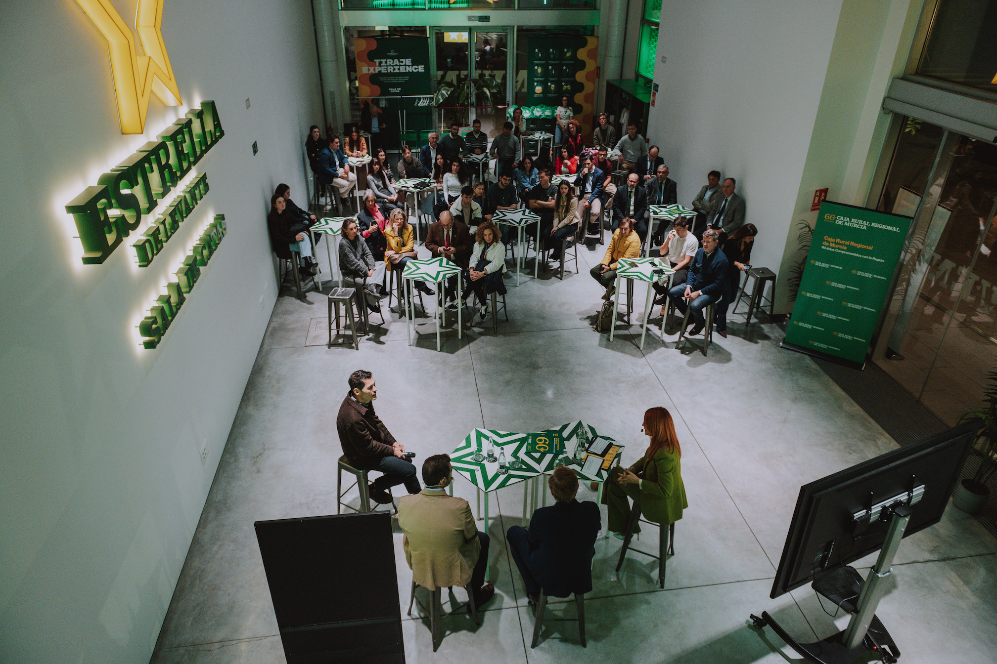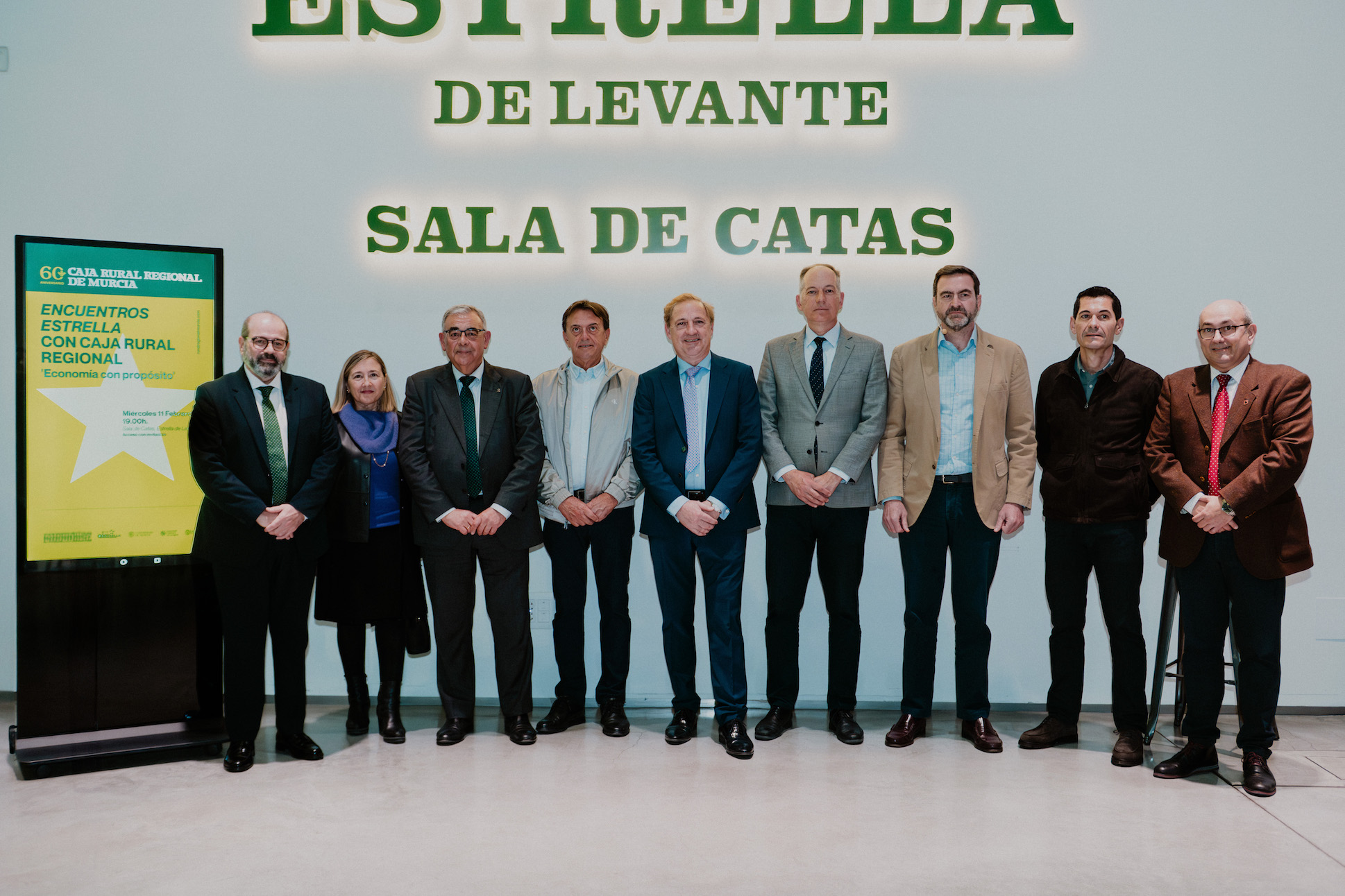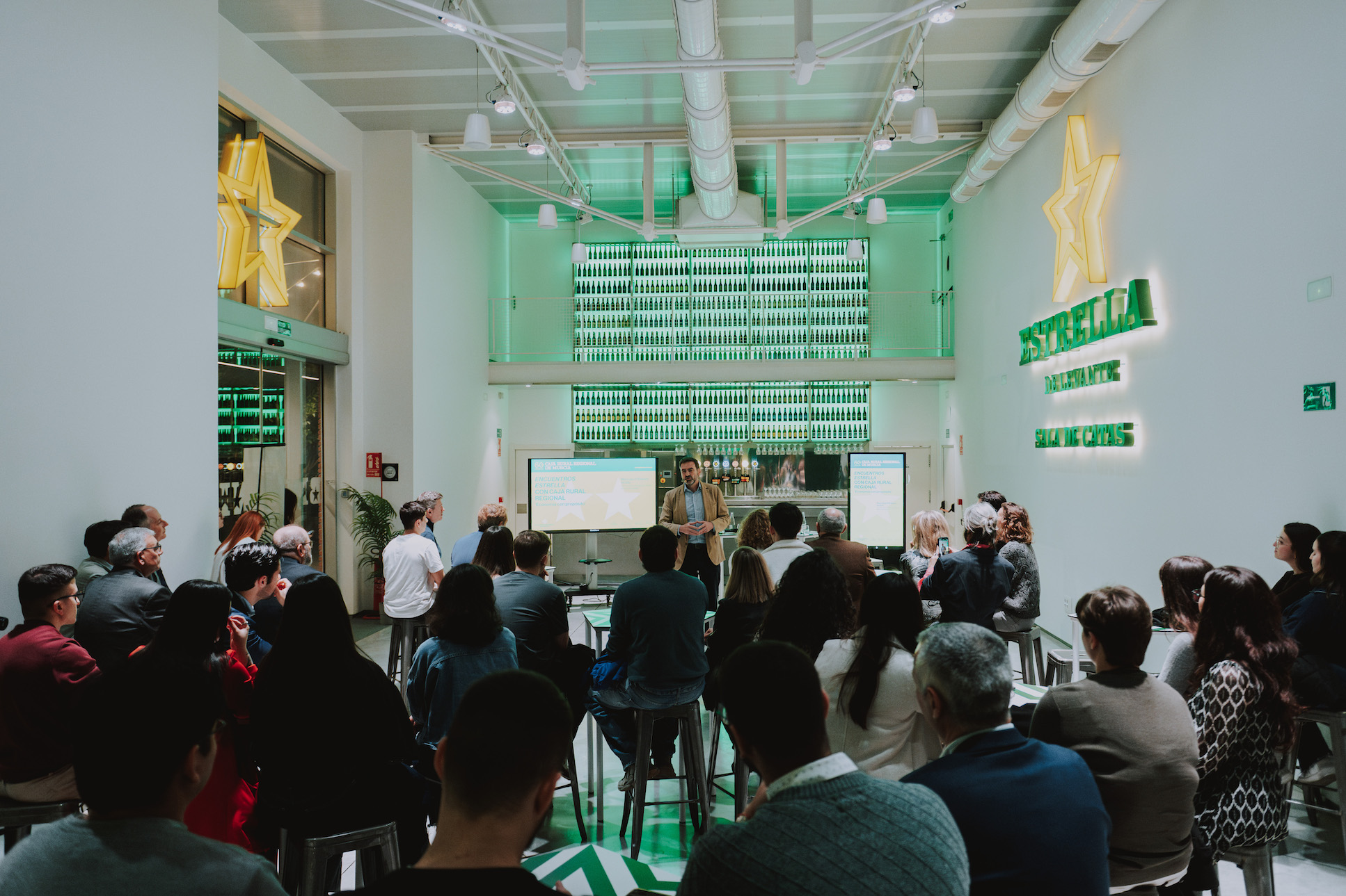 La Sala de Catas de Estrella de Levante acogió en la noche del miércoles 11 de febrero la primera edición de Encuentros Estrella, el foro joven impulsado por Caja Rural Regional de Murcia con motivo de su 60 aniversario, que demostró su capacidad de convocatoria al completar aforo y reunir a decenas de estudiantes universitarios con algunos de los empresarios más destacados de la Región.