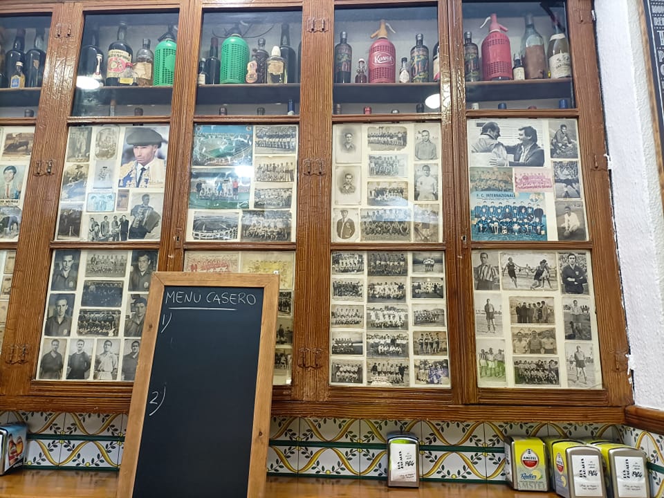El interior del local conserva la estética de las tabernas de antaño: barra metálica de larga trayectoria, vitrinas que exhiben las tapas, barricas decorativas y paredes adornadas con fotografías históricas del Real Murcia y de corridas de toros, reflejo de las aficiones de generaciones anteriores de la familia.