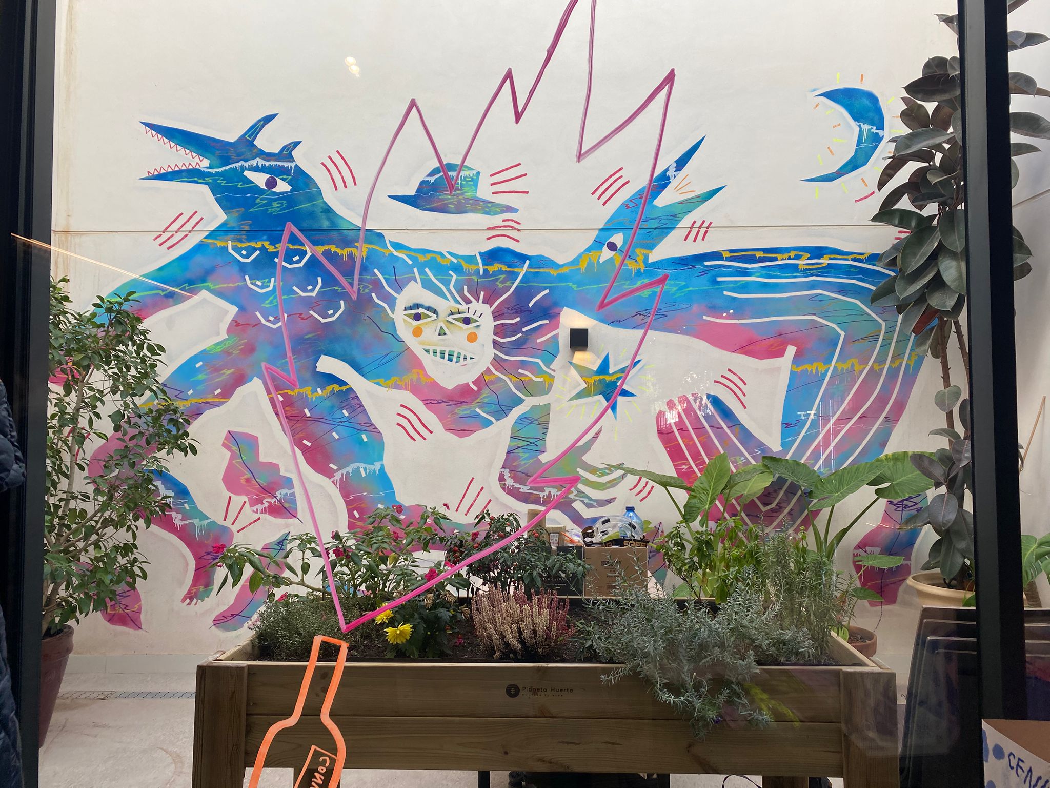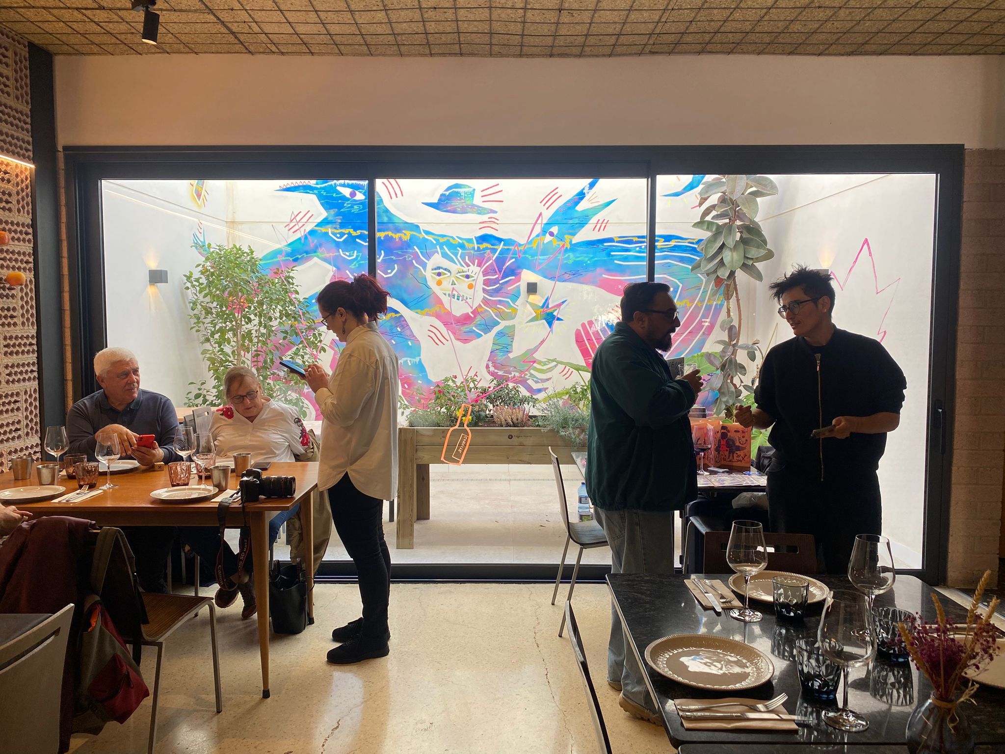 El patio interior de Taller de Sabores, en Bullas, se ha convertido en un lienzo vivo gracias al mural realizado por Coco Guzmán (Coco Riot), artista multidisciplinar, muralista y referente del cómic queer y feminista. Durante tres días, Coco pintó en directo, mientras el restaurante funcionaba con normalidad, una obra dedicada a las abuelas, bisabuelas y mujeres del linaje familiar de la chef del restaurante Juana Fernández.
