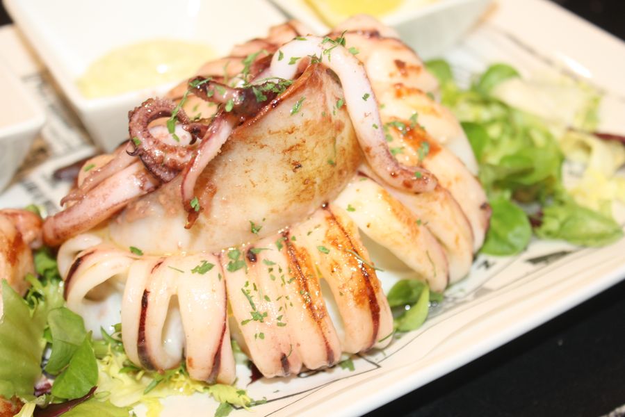 Los platos principales revelan la vocación del horno de brasas: pulpo (26 €) y calamar nacional (24 €) tiznados con maestría; carnes que van desde la pluma ibérica (19 €) hasta el chuletón para dos (59 €); y pescados como la ventresca de atún rojo a la sal (38 €) o el bacalao con salsa de piquillo (22 €). Para quien busca contención, el plato del día con bebida cuesta 8,50 €; con ensalada y café, 10,50 €.
