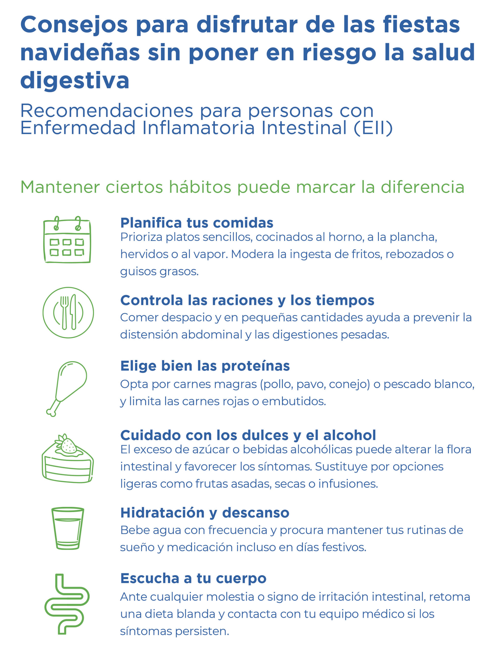 Los especialistas en EII recuerdan que la clave está en disfrutar con moderación y planificación, adaptando los menús festivos a las necesidades digestivas de cada persona.