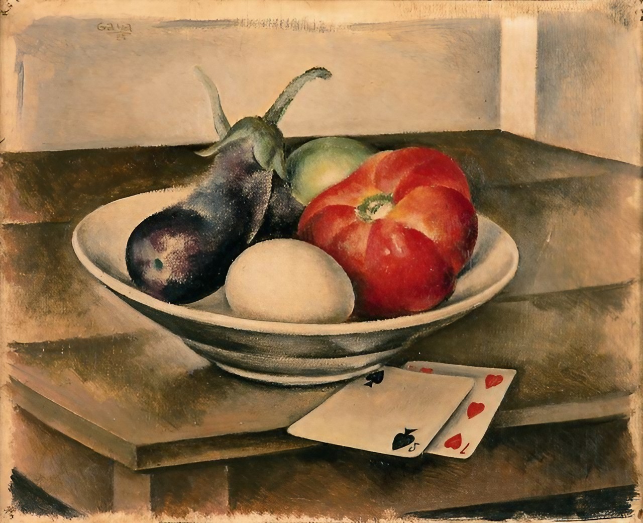 El bodegón presenta una disposición sobria pero cuidadosamente equilibrada: un sencillo cuenco blanco con frutas y un huevo, dispuestos sobre una mesa de tonalidades terrosas, acompañados de dos naipes. Son elementos que parecen haber sido escogidos deliberadamente por su simbolismo y su invitación a la contemplación. El huevo representa la vida, la pureza y la perfección; las frutas (berenjena y tomate), evocan la riqueza de lo cotidiano a través de sus colores y texturas. Las cartas pueden aludir al azar, al destino o incluso a la fugacidad de la vida, temas recurrentes en la pintura de bodegón. Con su inclusión, el pintor introduce un elemento narrativo o simbólico que rompe con la quietud del resto de la composición.