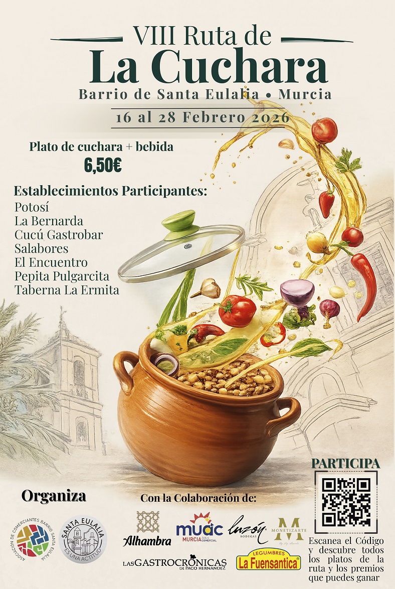 El vapor se elevará como incienso callejero desde las ollas de Santa Eulalia cuando, este lunes 16 de febrero, arranque la VIII Ruta del Plato de Cuchara, cita gastronómica que transforma el barrio más antiguo de Murcia en templo vivo de la cocina de raíz. Durante trece días, siete establecimientos —Potosí, La Bernarda, Cucú Gastrobar, Salabores, El Encuentro, Pepita Pulgarcita y Taberna La Ermita— servirán creaciones humeantes a 6,50 euros (plato y bebida incluidos), invitando a vecinos y visitantes a recorrer sus estrechas calles con el «rutómetro» en mano para sellar cada parada y optar a premios que van desde pases dobles a las bodegas Luzón hasta vales de 150 euros para comercios locales.