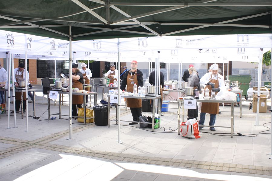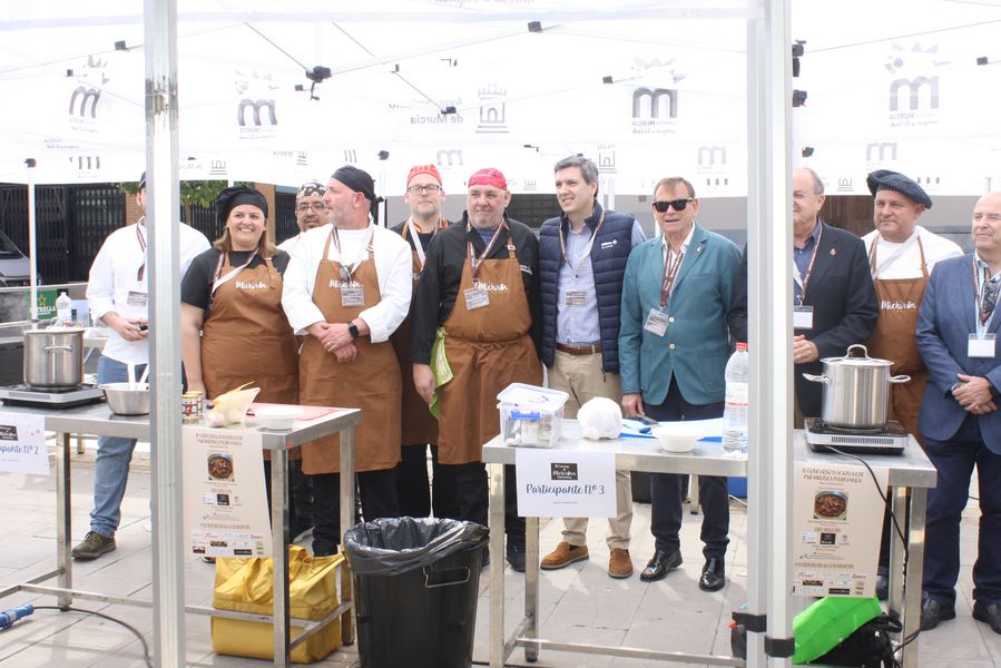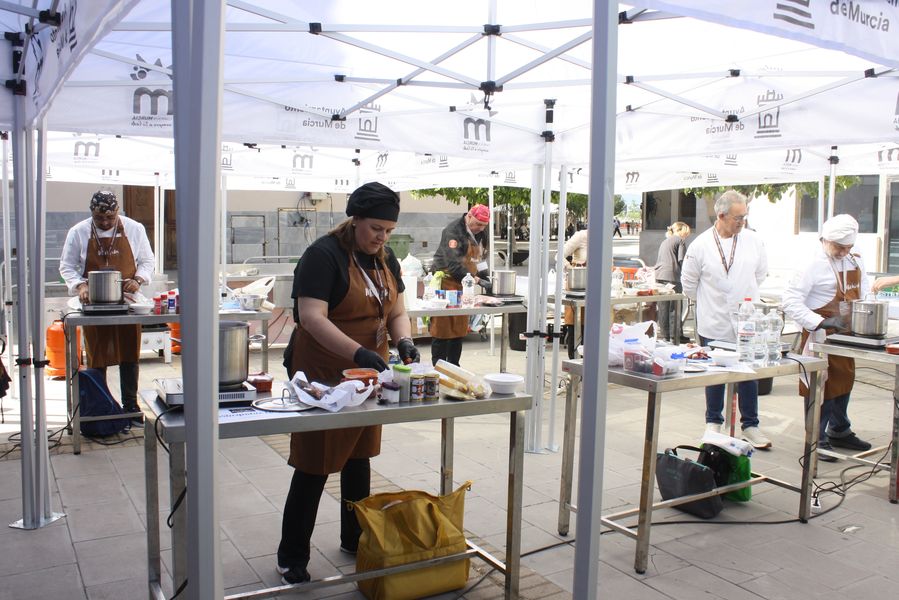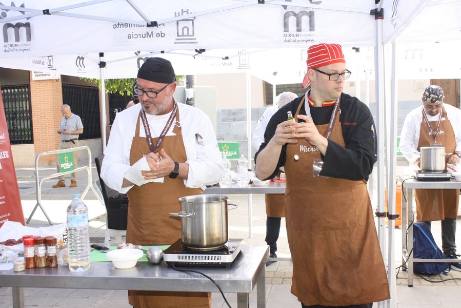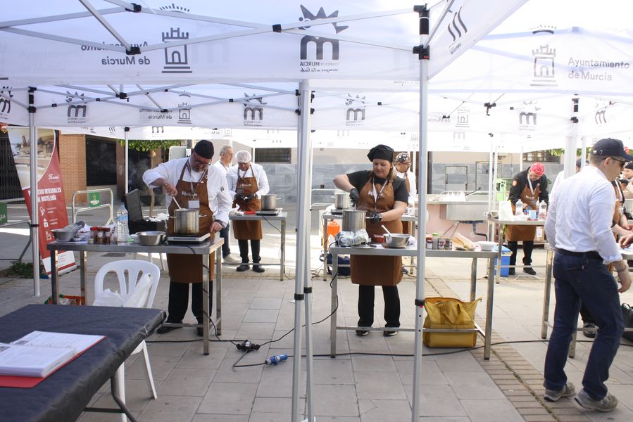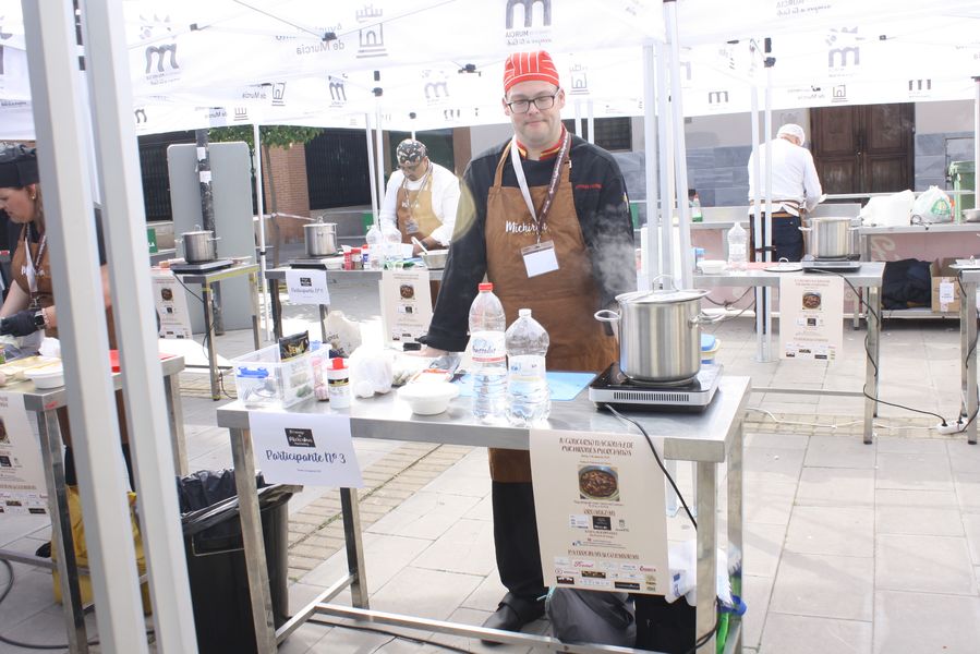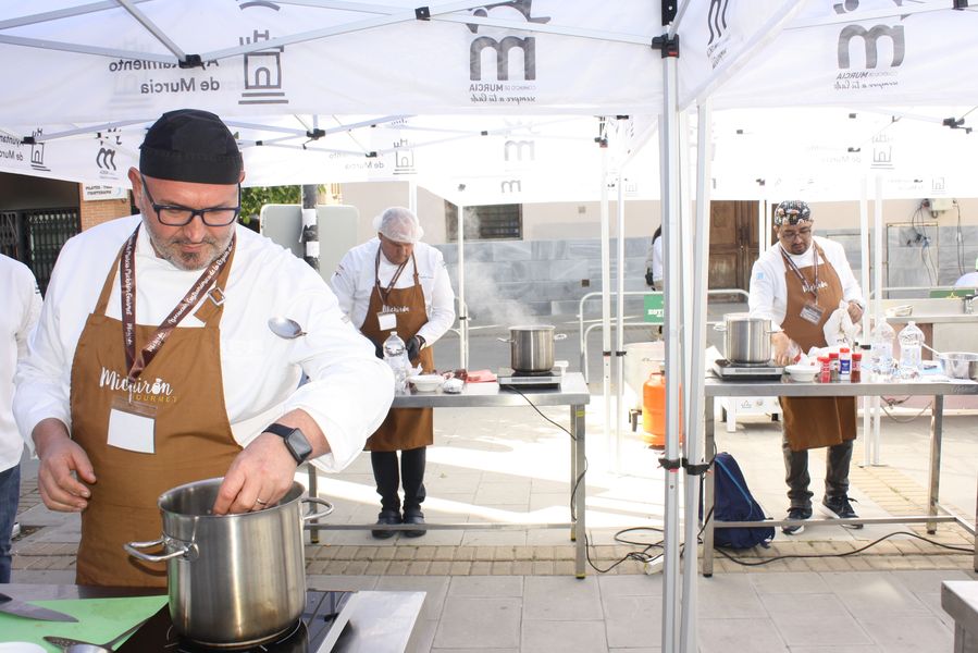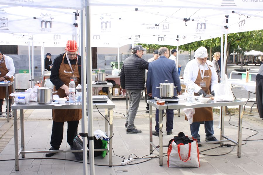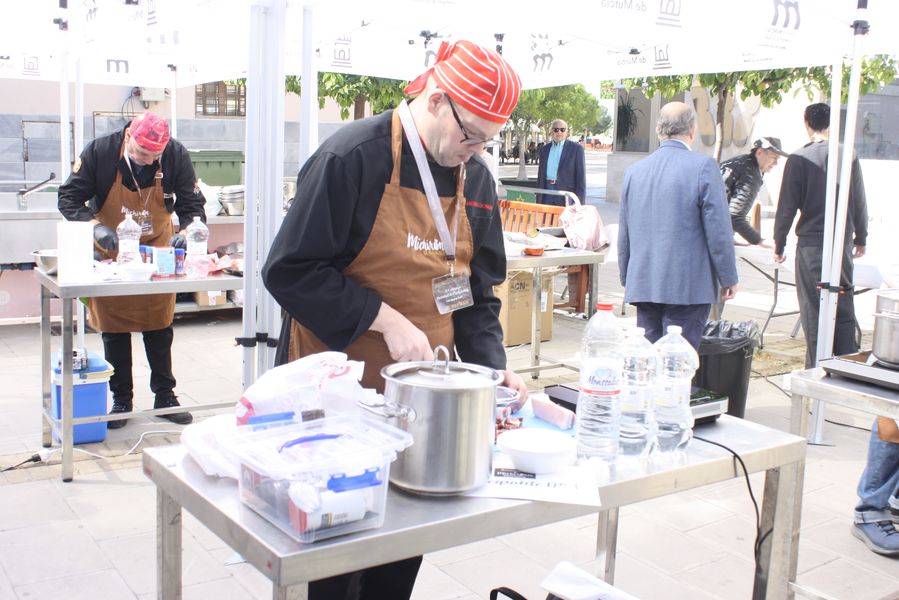 La jornada arrancó con la acreditación de los participantes, quienes, ataviados con el uniforme reglamentario, recibieron los ingredientes base: michirones, agua, huesos de jamón y sobrasada de chato murciano. A partir de ahí, cada cual desplegó su particular interpretación de la receta, respetando escrupulosamente la tradición pero imprimiendo su sello personal.
