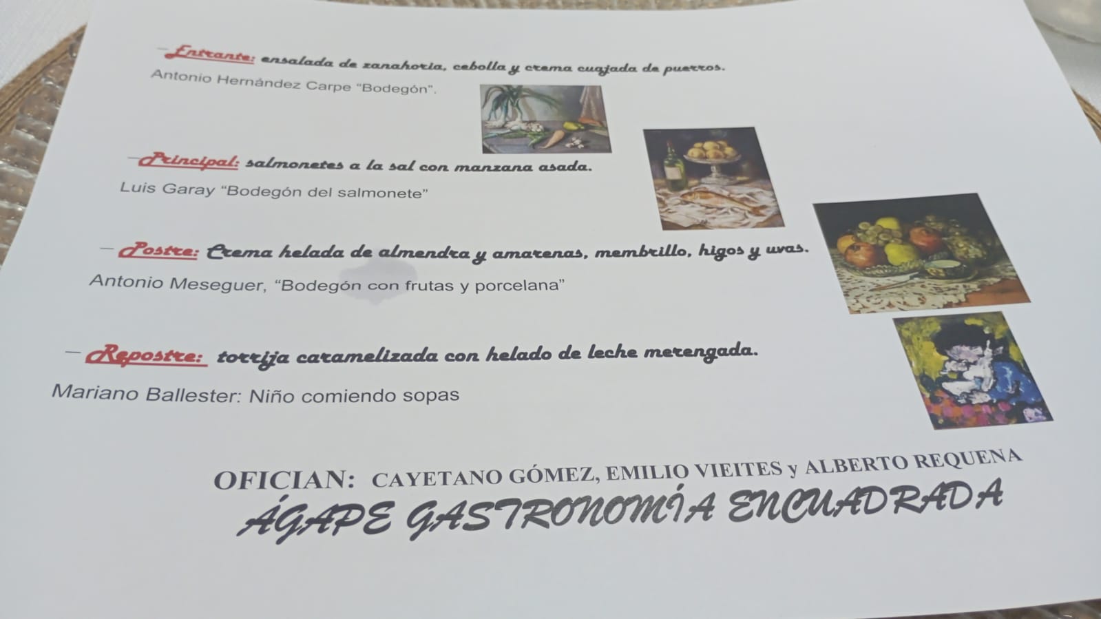 Y finalmente, una torrija caramelizada con helado de leche merengada, guiada por Niño comiendo sopas de Mariano Ballester, obra íntima y entrañable que evocó el consuelo de la infancia, el calor del hogar y la sencillez que abraza.