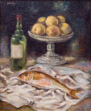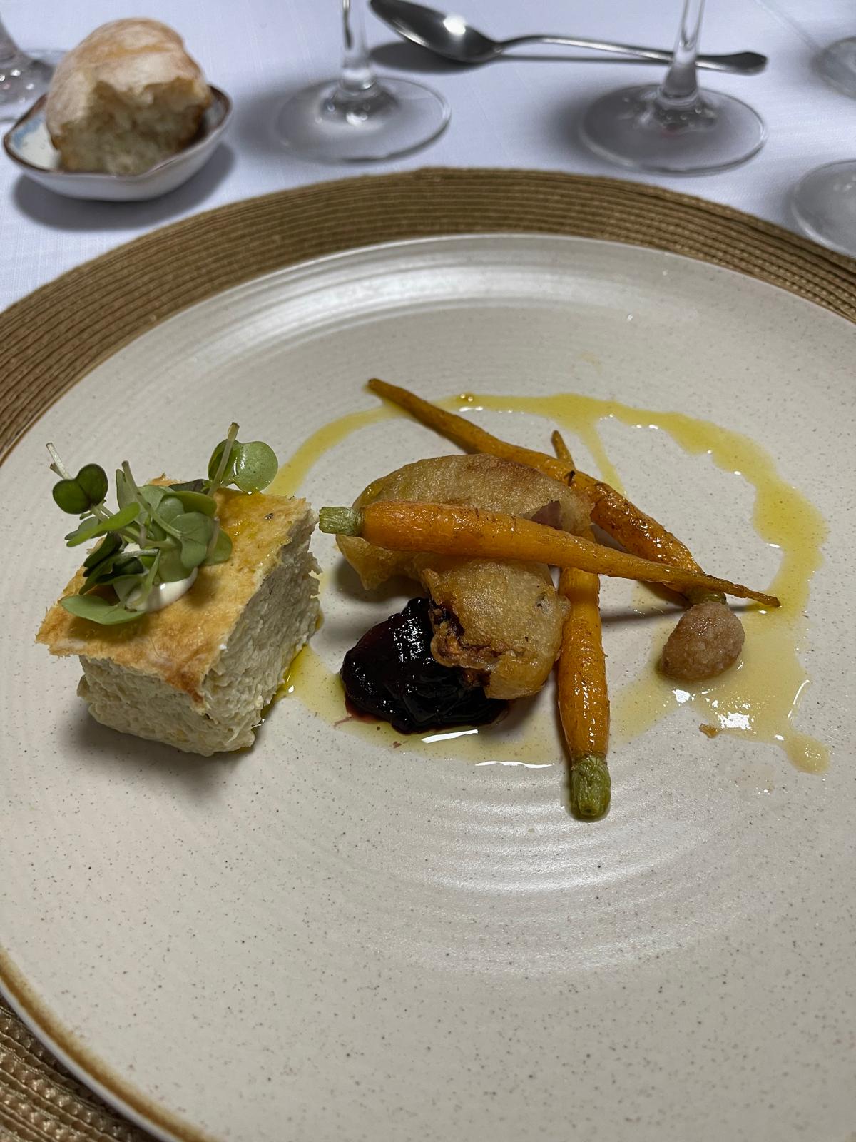 El entrante —una ensalada de zanahoria, cabolla y crema cuajada de puerros— dialogó con el Bodegón (1947) de Antonio Hernández Carpe, obra de una sobriedad conmovedora que exaltaba lo cotidiano con reverencia. A continuación, el plato principal elevó el mar al altar: salmonetes a la sal con manzana asada, inspirados en el Bodegón del salmonete de Luis Garay, donde el pescado no era lujo, sino presencia silenciosa y esencial.