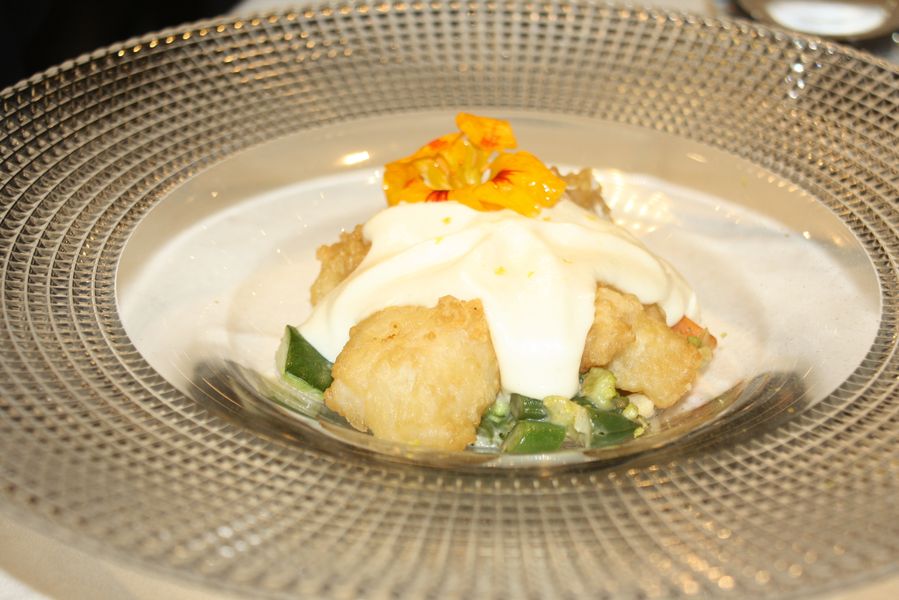 Como plato principal, la merluza en tempura con encurtidos y mayonesa de lima kaffir aporta frescura y sofisticación.