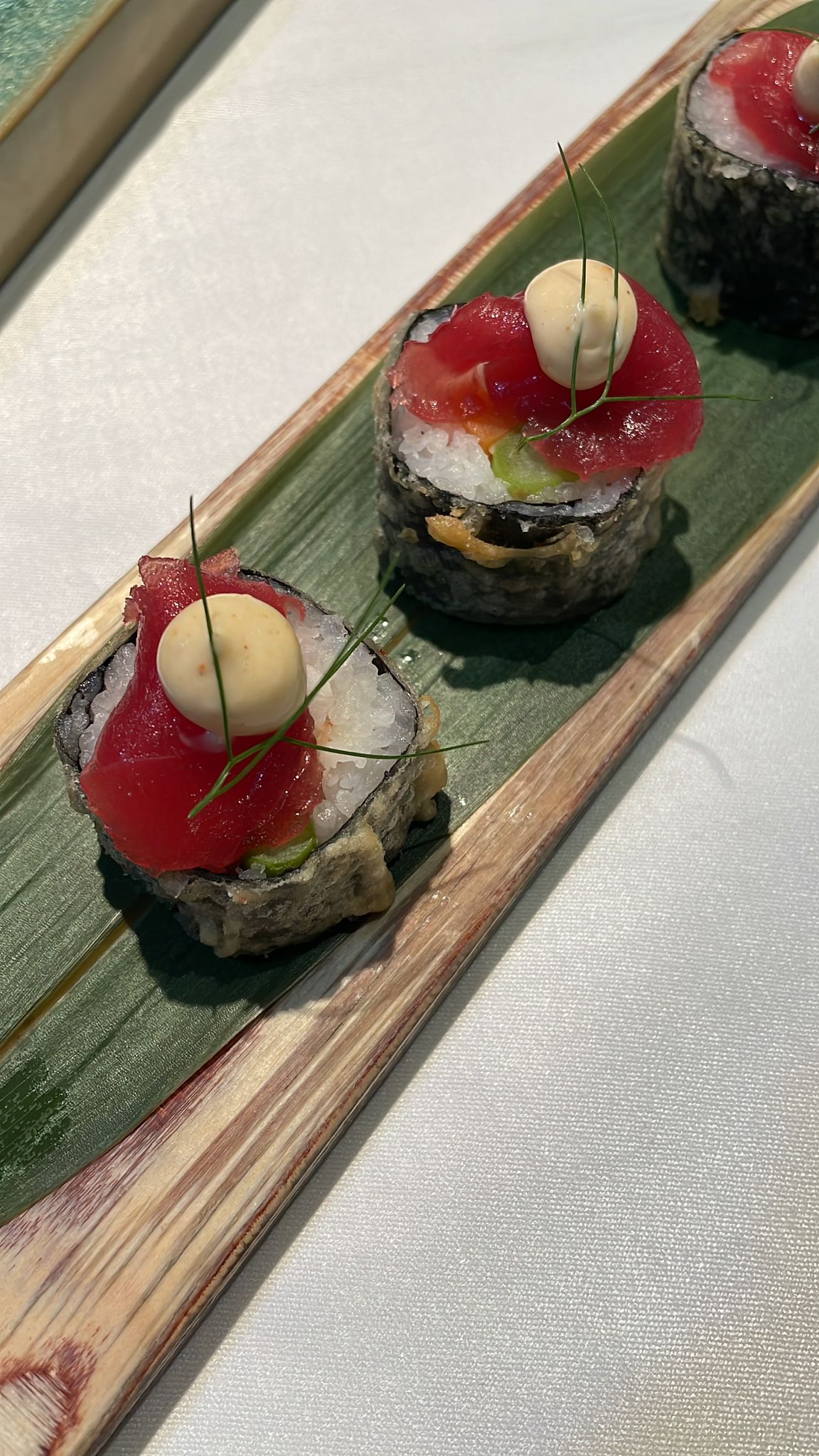 La velada arranca con influencias asiáticas: uramaki de langostinos bañados en salsa chili garlic y un futomaki tempurizado de atún rojo coronado con esferas de anchoa, que liberan su intensidad al ser mordidas. A continuación, la cocina mediterránea se impone con la gamba blanca rebozada en tempura, acompañada de patatas paja y huevo frito, una combinación que equilibra crujiente y cremosidad.