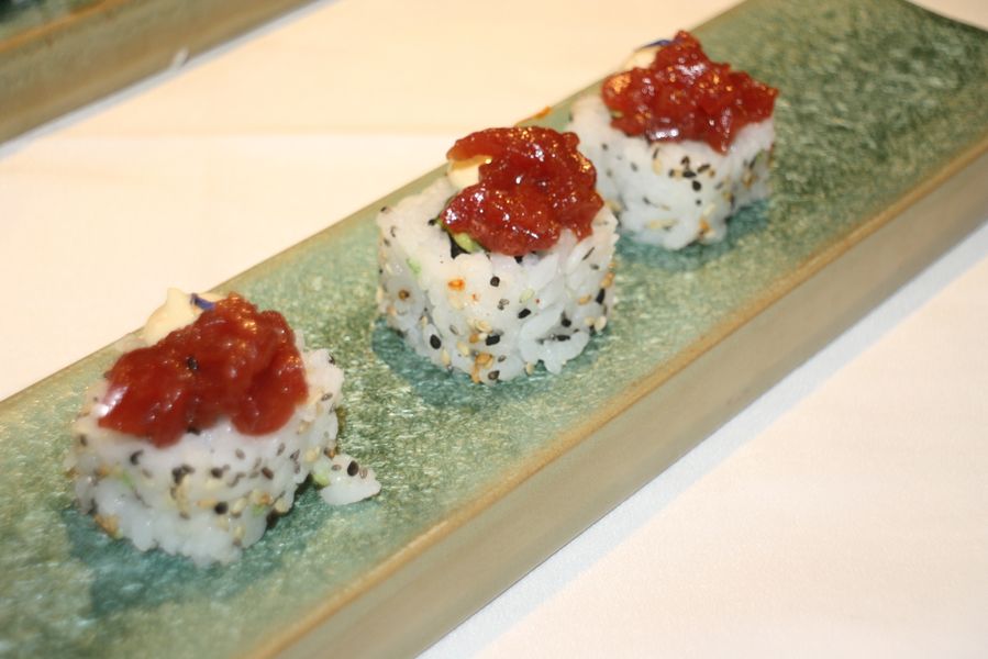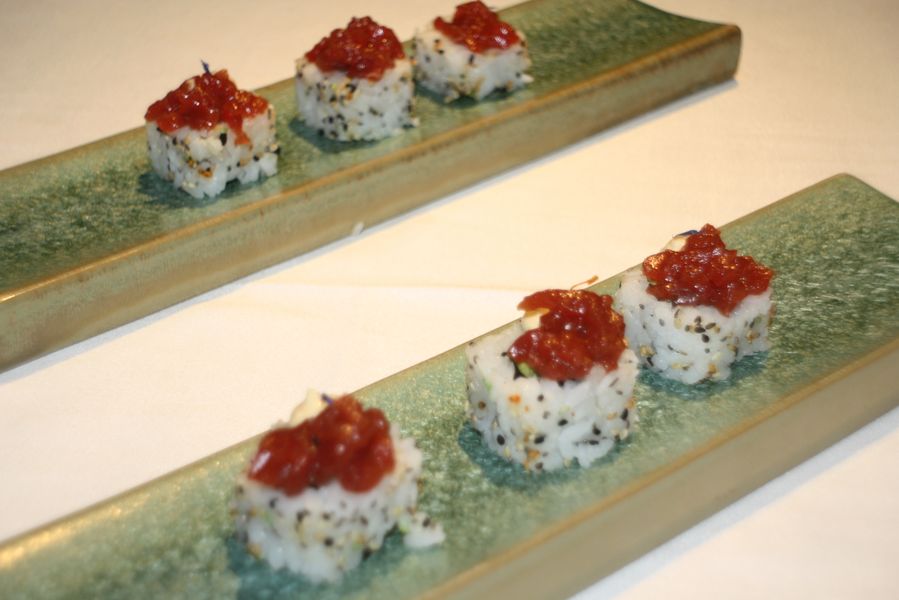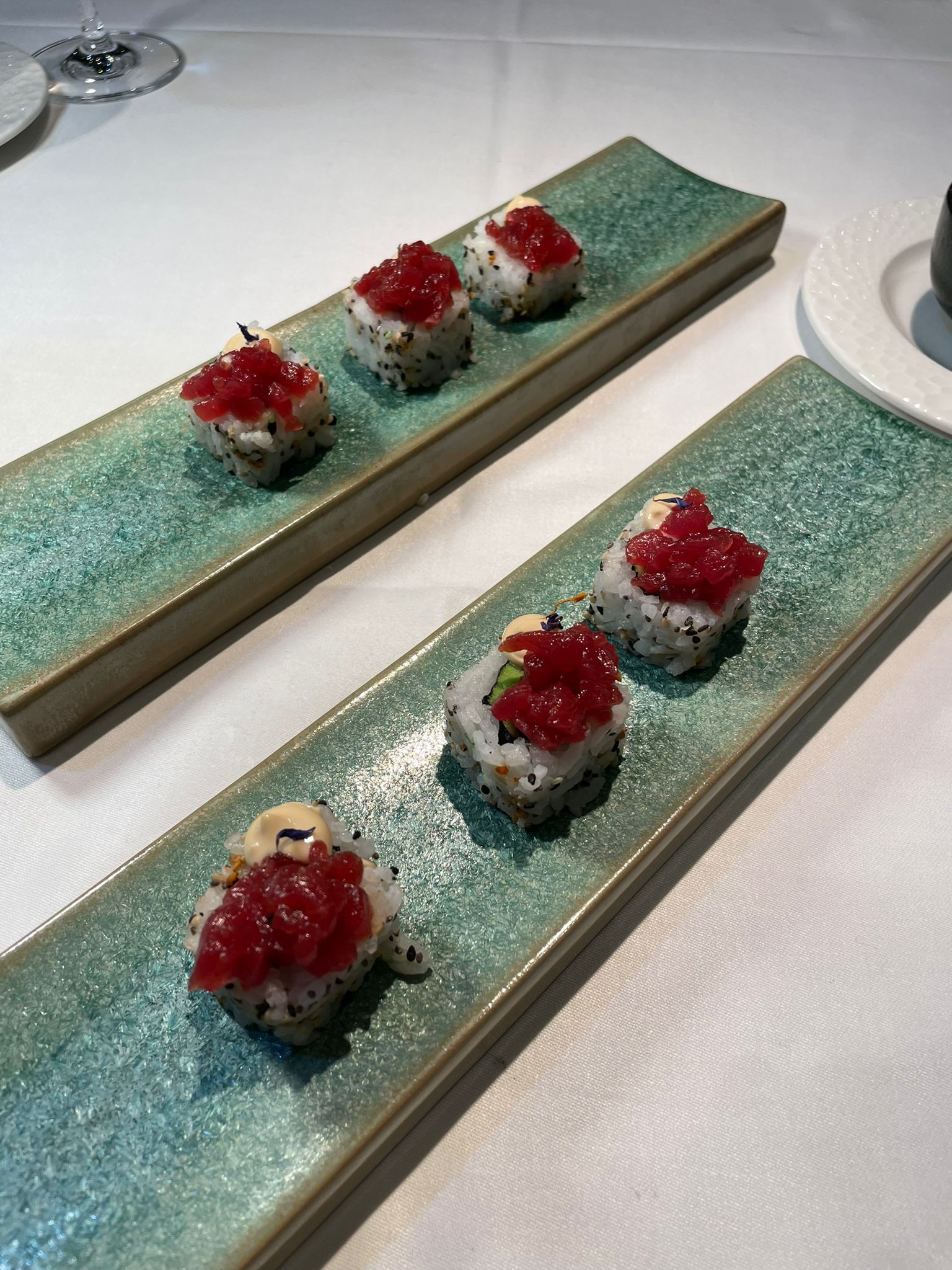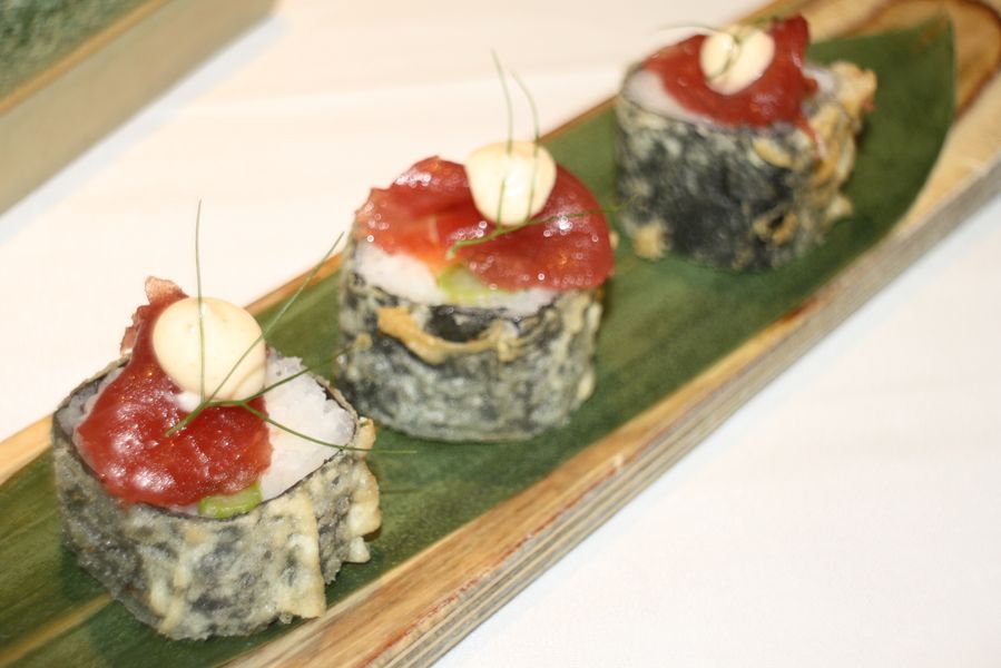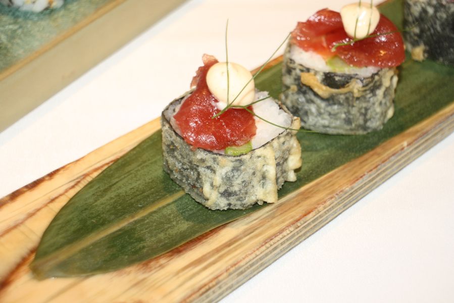 La velada arranca con influencias asiáticas: uramaki de langostinos bañados en salsa chili garlic y un futomaki tempurizado de atún rojo coronado con esferas de anchoa, que liberan su intensidad al ser mordidas. A continuación, la cocina mediterránea se impone con la gamba blanca rebozada en tempura, acompañada de patatas paja y huevo frito, una combinación que equilibra crujiente y cremosidad.