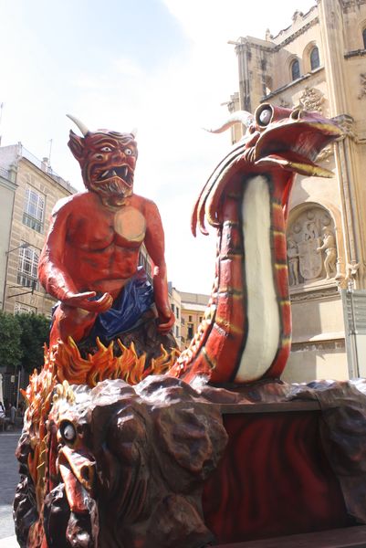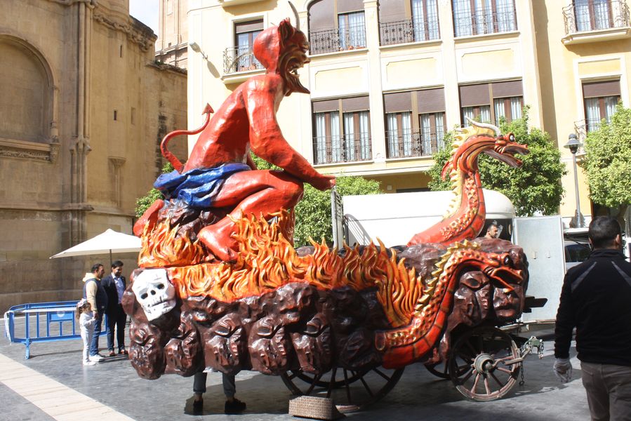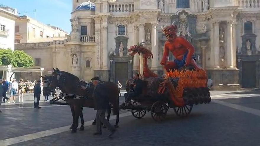 El núcleo del cortejo lo constituyen cuatro vehículos históricos tirados por caballos, bautizados con los nombres que aparecían en las crónicas de antaño: El Infierno, Dragones, Apolo y Sirenas y Sardinas. La reconstrucción de estas estructuras, llevada a cabo por Carrozas Muñoz, ha requerido la colaboración de múltiples entidades, desde el Rincón Huertano, que ha prestado los carros, hasta empresas responsables de la caballería.