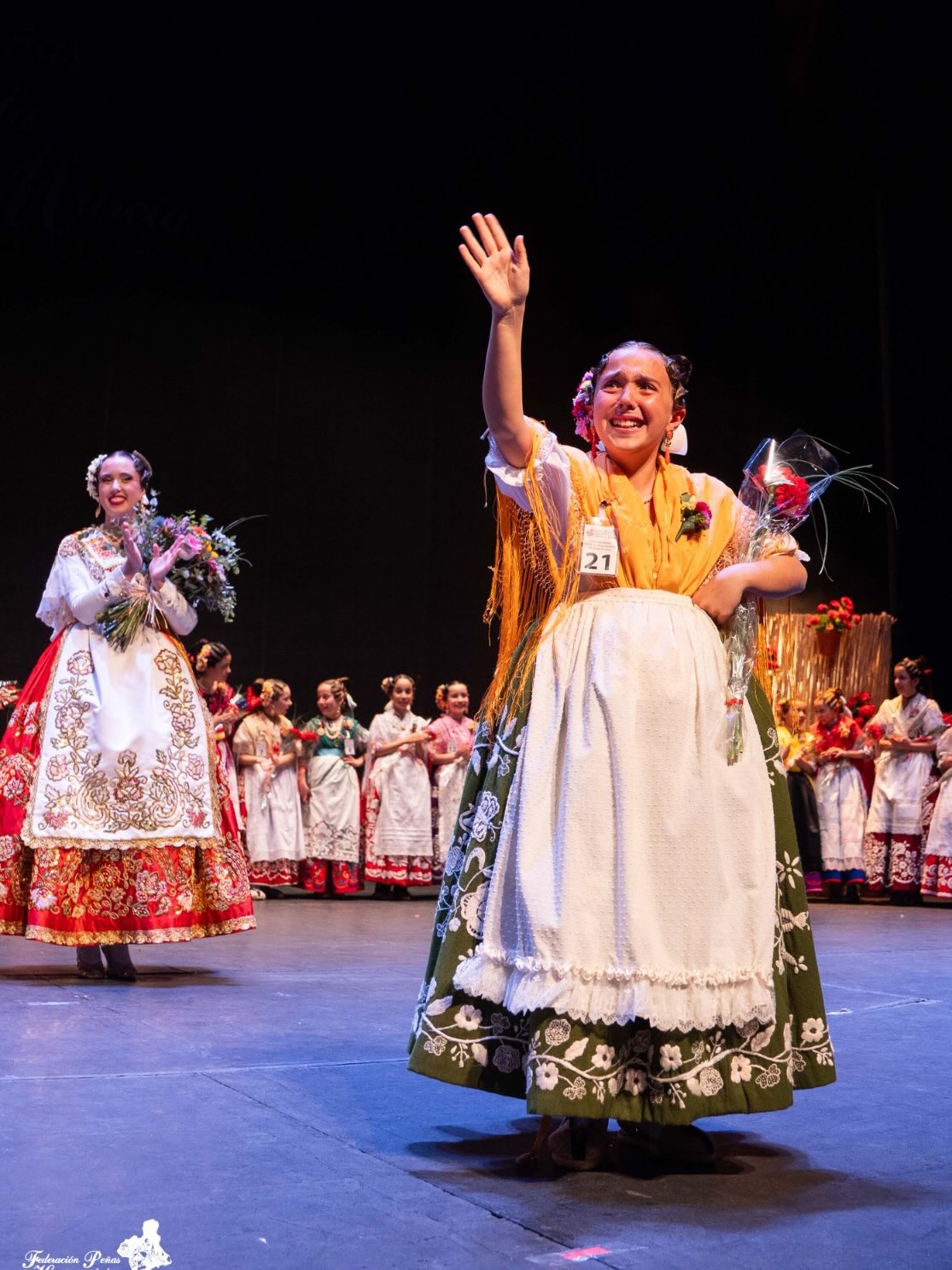 La tensión fue palpable cuando los concejales de Cultura y Turismo del Ayuntamiento de Murcia, Diego Avilés y Jesús Pacheco, respectivamente, revelaron los nombres de las ganadoras entre las quince finalistas de cada categoría. Ángela Muñoz, visiblemente emocionada, recogió el testigo de la reina saliente, Alba Franco, mientras que Leonor Antón sucedió a Alejandra Belmonte en el trono infantil. Juan García Serrano, presidente de la Federación de Peñas Huertanas, puso en valor la transparencia del certamen, asegurando que la decisión del jurado se basó en detalles mínimos dada la alta calidad de todas las aspirantes.