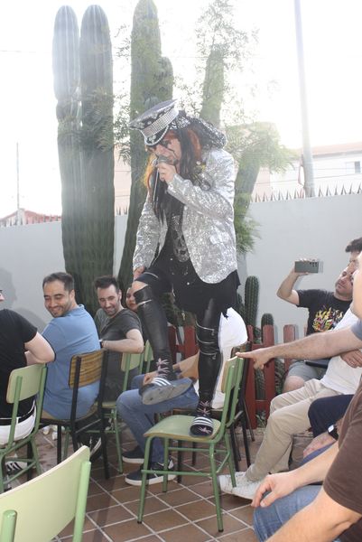 De regreso al área de celebración, dio comienzo el almuerzo principal, una auténtica fiesta de la carne a la brasa: chuletones jugosos, pollo a la brasa y otras carnes seleccionadas se sirvieron en abundancia, acompañadas de vino y cerveza. La sobremesa, sin embargo, no tuvo tiempo de enfriarse: los integrantes de Bochornorama —el dúo formado por Charly Glamour en voz y Dave Demonio a la guitarra— decidieron adelantar su actuación y sorprendieron al público con una interpretación improvisada de algunos de sus temas más icónicos, justo en mitad de los platos.