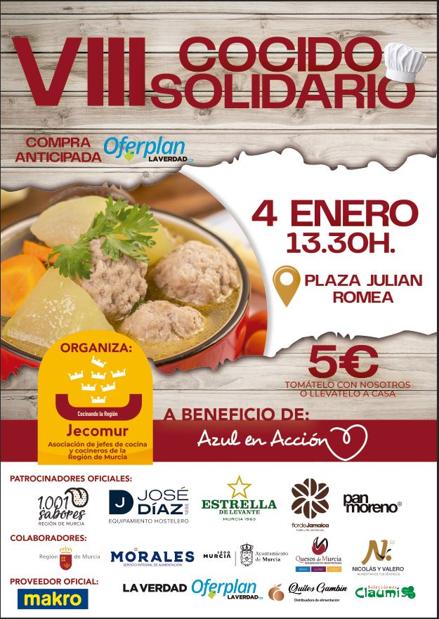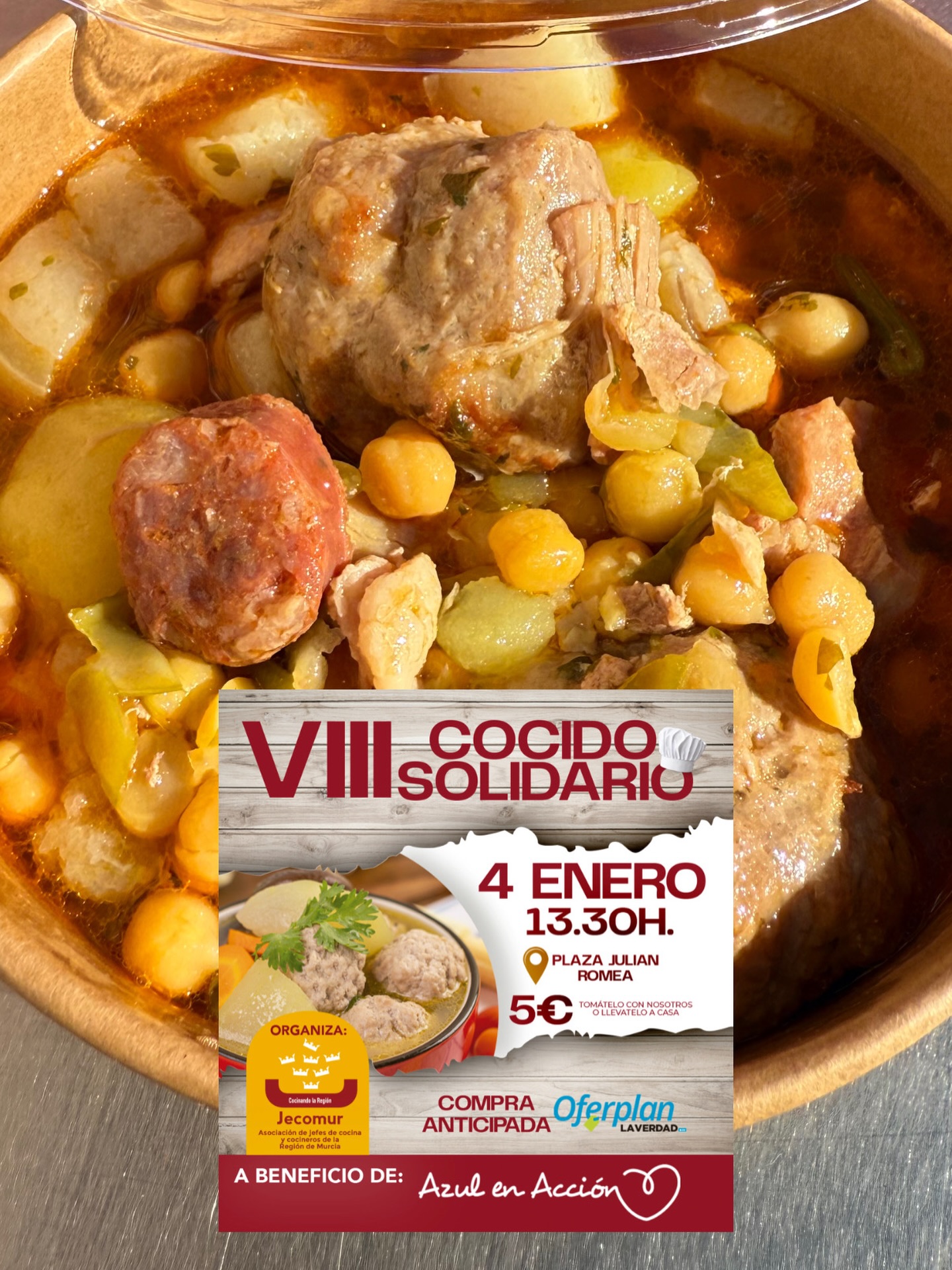Apenas cuatro días después de las campanadas, Murcia retomará uno de sus ritos más entrañables y comprometidos: el VIII Cocido Solidario, organizado por Jecomur (Asociación de Jefes de Cocina de la Región de Murcia), en favor de la ONG Azul en Acción. El evento, que se celebrará el domingo 4 de enero de 2026 en la Plaza Julián Romea, comenzará a las 10:00 horas con la venta de la tradicional Galleta Solidaria, y a las 13:00 horas dará comienzo la distribución del plato estrella: una ración generosa de cocido murciano, elaborado en directo por decenas de chefs voluntarios, por solo 5 euros.