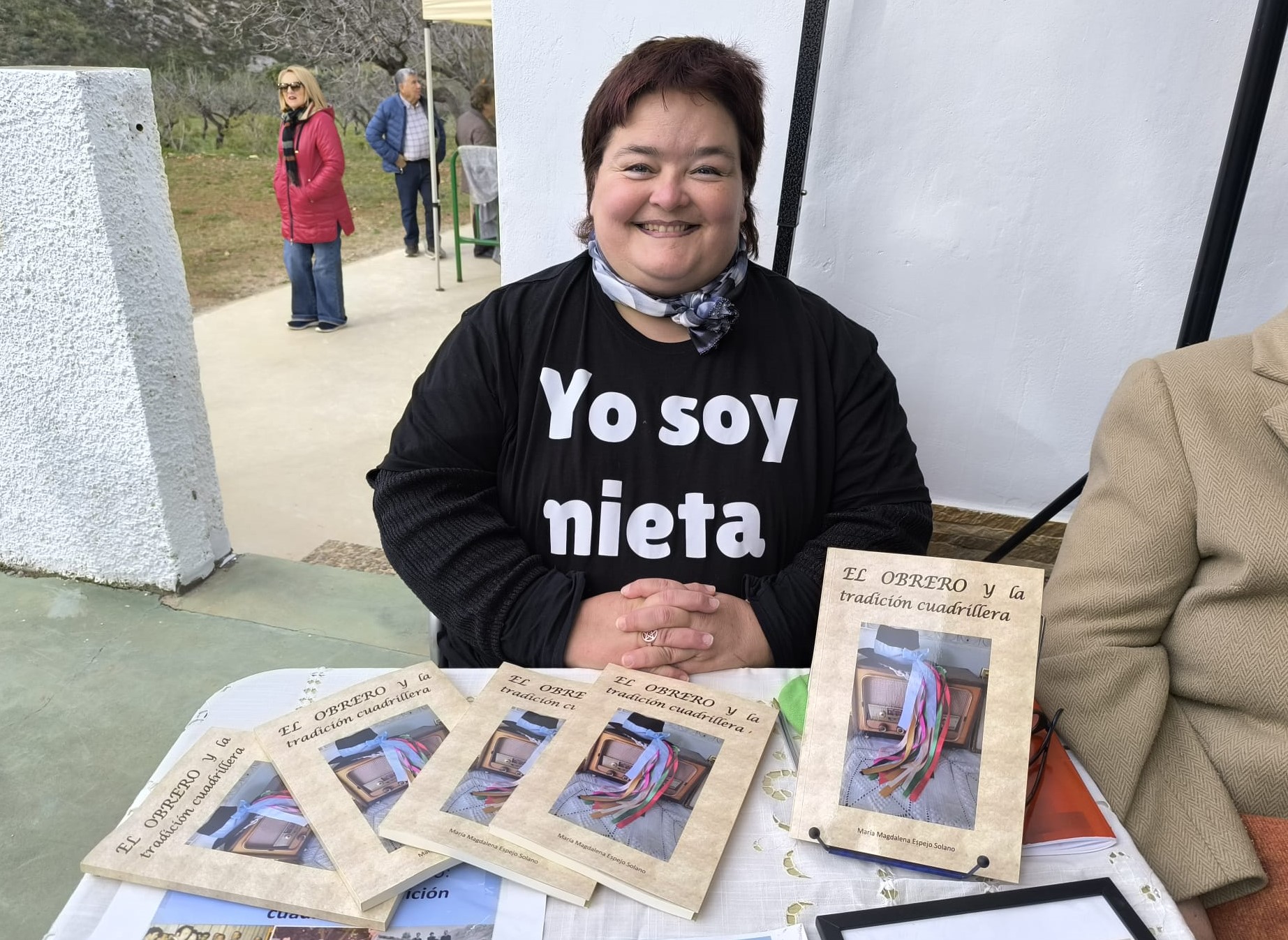 Durante todo el día Magdalena Espejo puso un puesto de su libro ‘El Obrero y la tradición cuadrillera’, escrito sobre su abuelo Francisco Solano. Nacido en 1911 en el Rincón de Tallante, fue un histórico poeta, cantaor, trovero y uno de los primeros maestros de los ‘Cantos de Pascua’ del campo de Cartagena acompañando a las cuadrillas por múltiples lugares durante toda su vida.