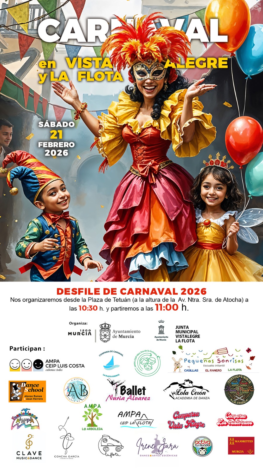Las comparsas que llenarán de ritmo, fantasía y color el desfile son la Comparsa Vistalegre, la Comparsa Los Trastornaos, Comparsa La Tribu y la Comparsa La Flota Cuenta. Los colegios que se unirán a la cita son el CEIP Luis Costa, CEIP La Flota, CEIP Ntra. Sra. De la Arrixaca, CEIP La Arboleda, CEC Fuenteblanca y la Escuela Infantil Pequeñas Sonrisas.