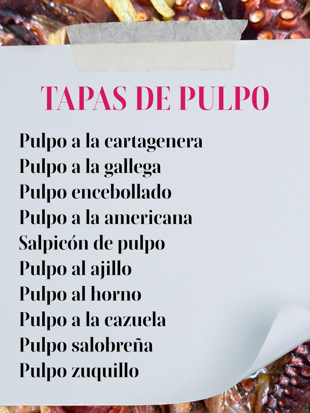 Pero la fiesta no termina ahí: Además El Carpi despliega un auténtico catálogo de tapas de pulpo con diez recetas distintas que recorren desde lo más tradicional a lo más innovador: a la cartagenera, a la gallega, encebollado, a la americana, salpicón, al ajillo, al horno, a la cazuela, Salobreña y la misteriosa Zuquillo —una creación propia que ha ganado legión de seguidores.