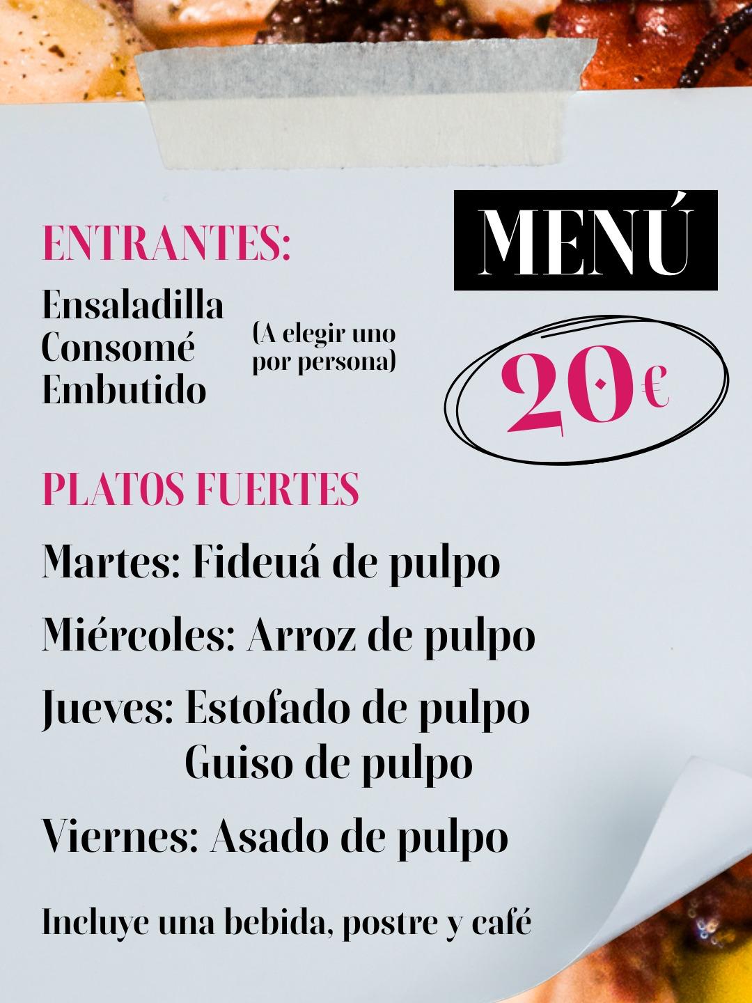 El menú diario incluye una entrada a elegir (ensaladilla, consomé o embutido), bebida, postre y café, por tan solo 20 euros.