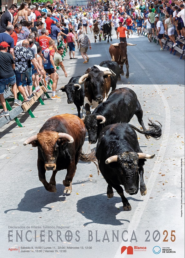 La imagen que ilustra este cartel, “una foto cargada de energía”, tal y como la ha definido su creador fue realizada desde la Gran Vía durante el último encierro celebrado en Blanca el pasado 2024. En palabras de Frutos Molina: “Es una escena con mucha profundidad, ya que se inicia la visión de la fotografía en los novillos y cabestros situados en primer plano, para dar paso a los cabestros y mozos que cierran la carrera y cuenta con la complicidad visual de los vallados atestados de gentío, que dirigen la vista hacia el fondo”.