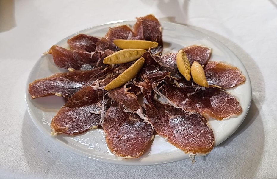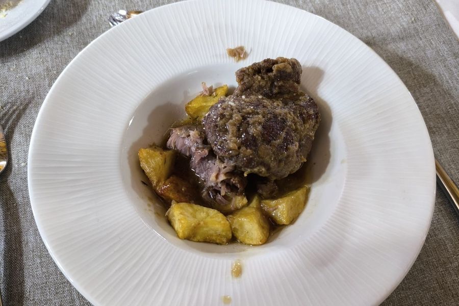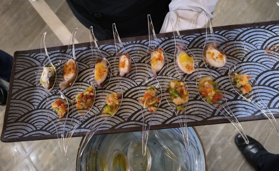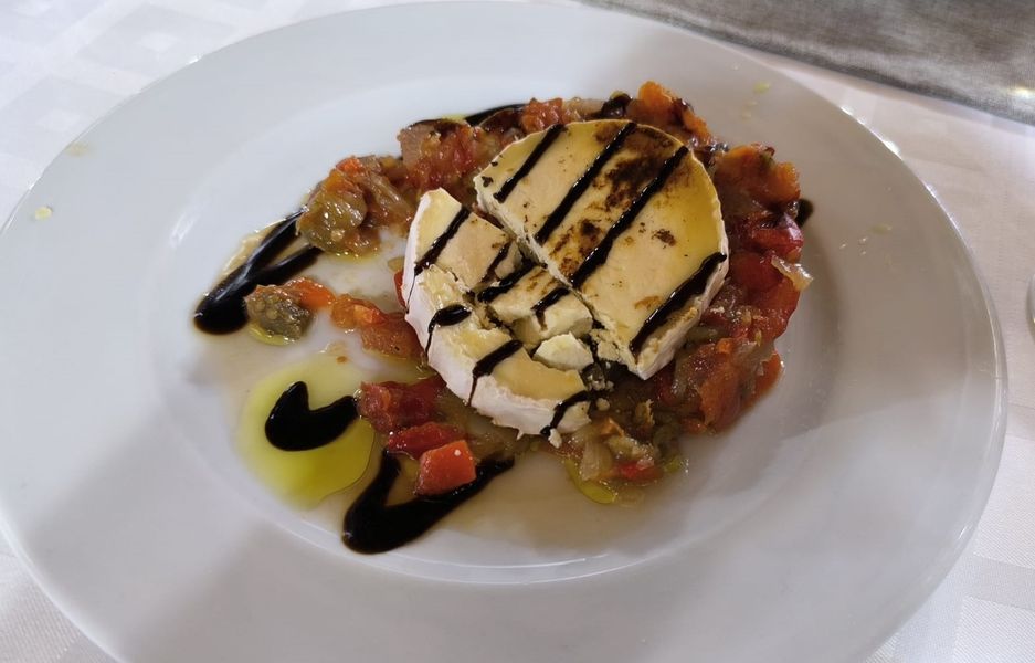 Al centro de la mesa se sirvió timbal de escalivada con rulo de cabra gratinado, surtido de ibéricos con queso manchego, revuelto de gulas y gambón con ajetes y trigueros. Como plato principal individual se pudo elegir entre carrillera de cerdo al romero con daditos de patatas o bacalao al horno con cebolla caramelizada y piñones.