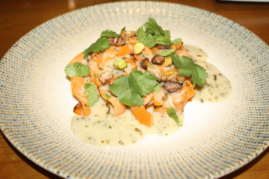 Zanahoria con comino, pistacho y hierbabuena —un guiño árabe, fresco y vibrante, que habla de la huerta y del Mediterráneo.