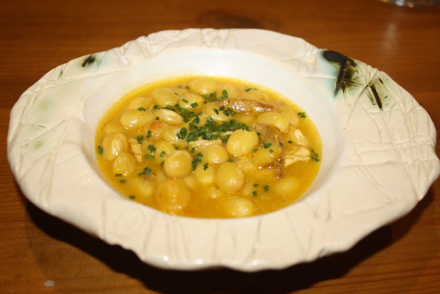 Pochas frescas con perdiz en escabeche —tradición revisada con precisión: el ave, caza local; las legumbres, de temporada; el escabeche, equilibrado, brillante.