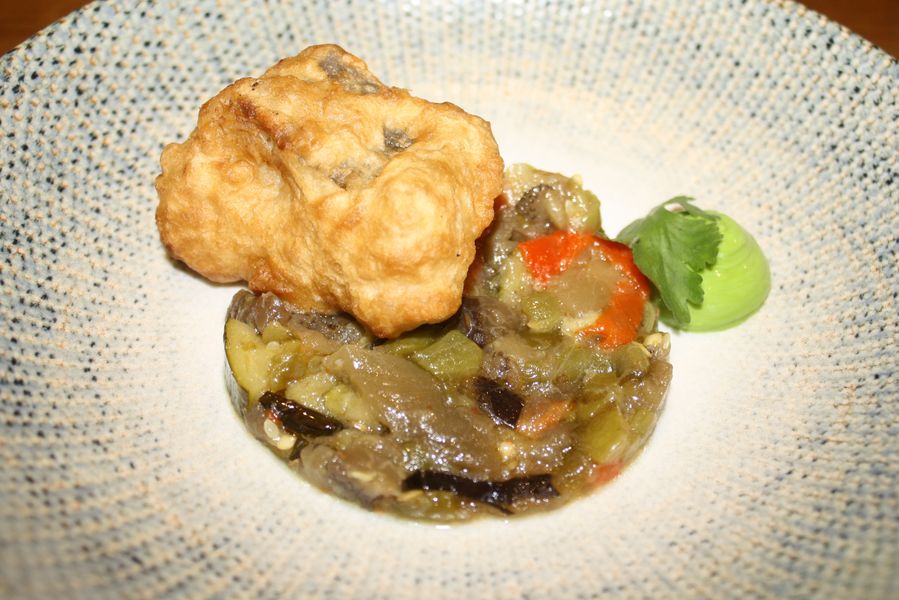 Orly de bacalao con asadillo de pimientos y mayonesa de perejil —crisp, jugoso, marinero, con ese punto de salinidad que une tierra y mar.