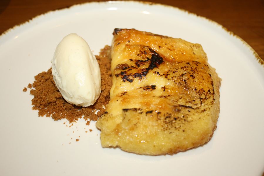 De postre, torrija caramelizada con helado y polvo de galleta, y panacotta de limón con zumo de lima verde —dulzor contenido, acidez inteligente, frescura sin artificios.