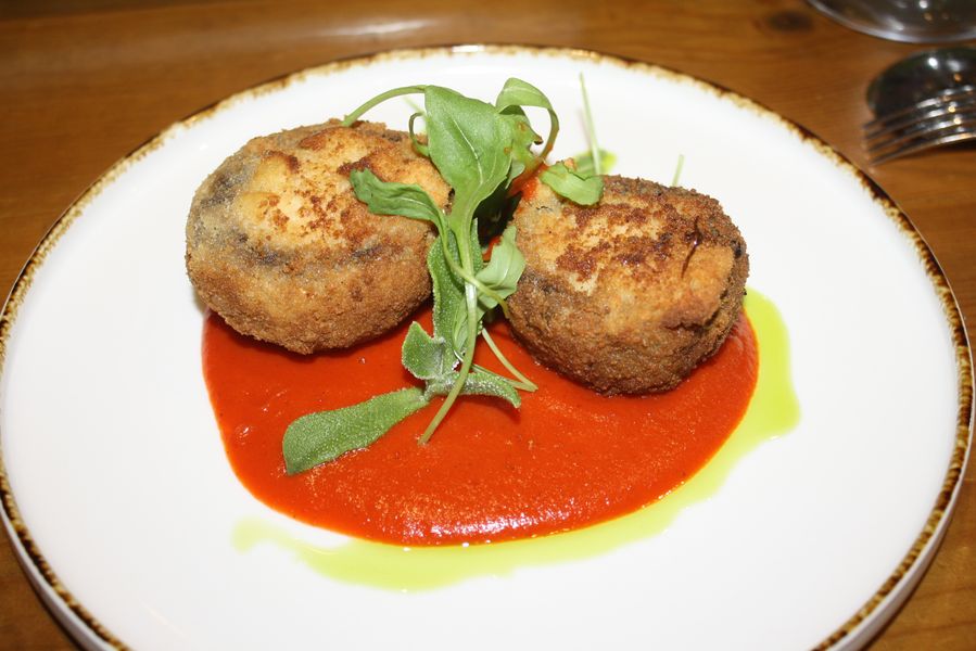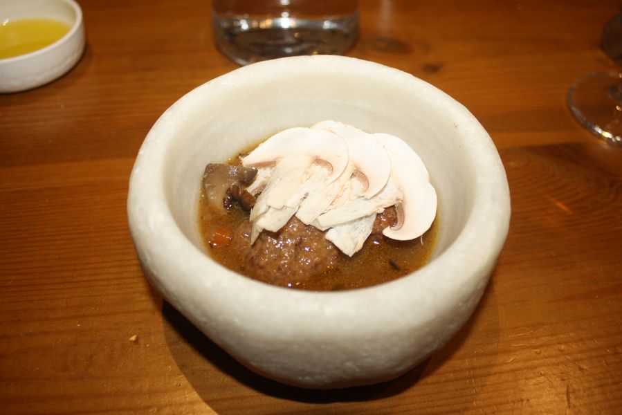Champiñón relleno con bechamel de jamón ibérico y puré de tomate asado —una elegancia humilde, terrosa.