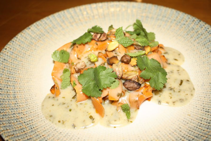 Zanahoria con comino, pistacho y hierbabuena —un guiño árabe, fresco y vibrante, que habla de la huerta y del Mediterráneo.