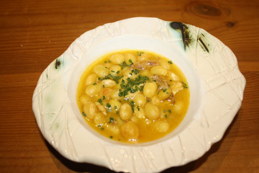Pochas frescas con perdiz en escabeche —tradición revisada con precisión: el ave, caza local; las legumbres, de temporada; el escabeche, equilibrado, brillante.