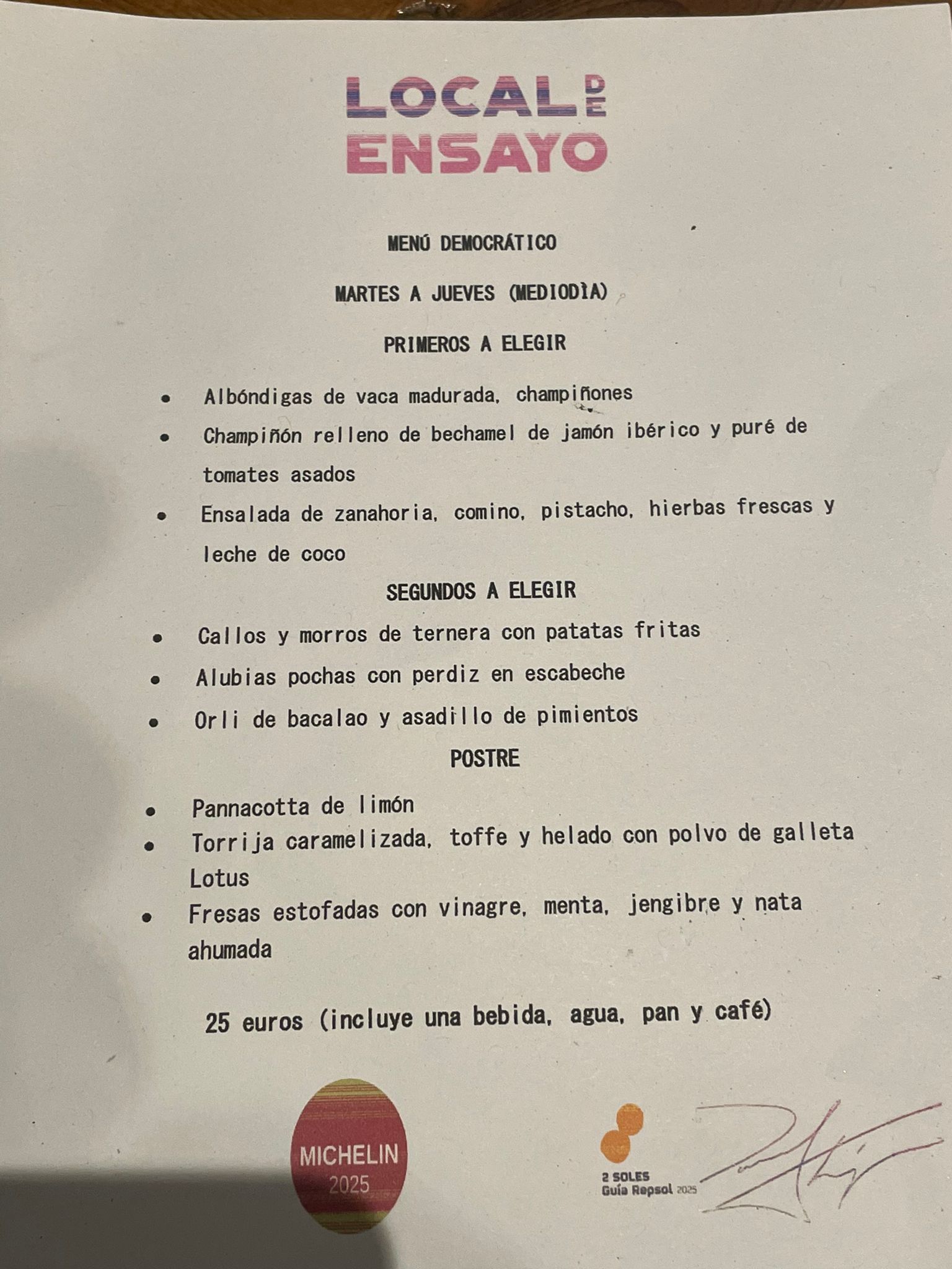 Desde julio, y de manera oficial a partir de enero de 2026, Local de Ensayo abre sus puertas de martes a viernes con un menú democrático, contundente, caliente, sabroso y rápido —porque, como subraya David—, «la gente ya no tiene tiempo ni ganas de estar tres horas sentada. Queremos que se sientan cómodos, que coman bien, que hablen, que rían… y que piensen: vuelvo la semana que viene».