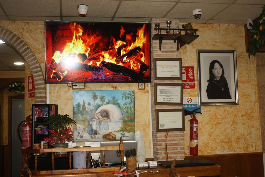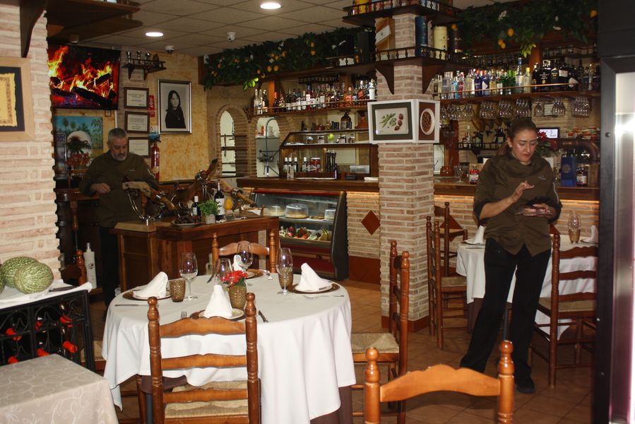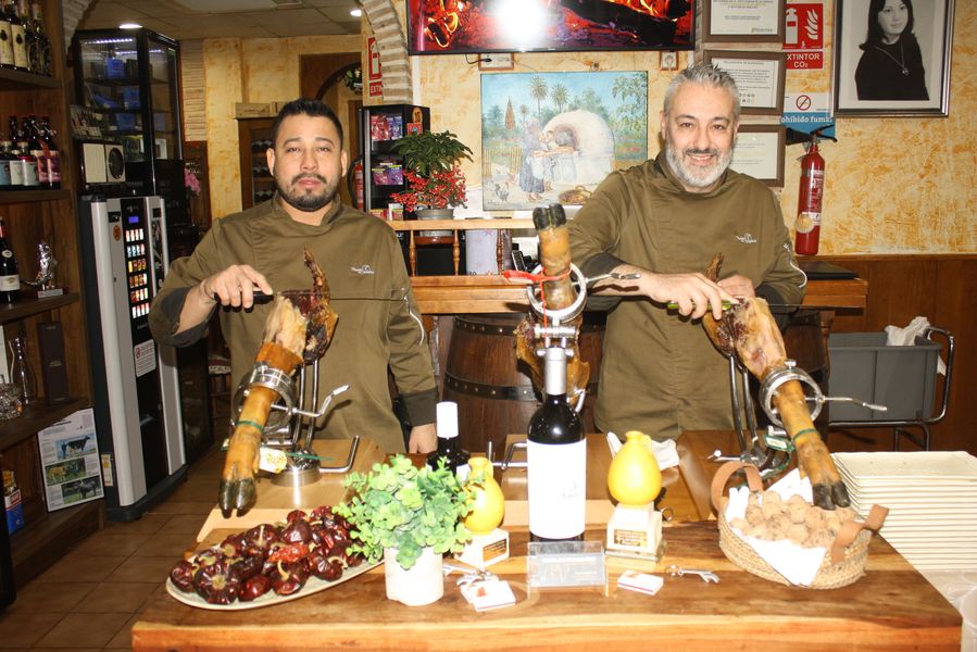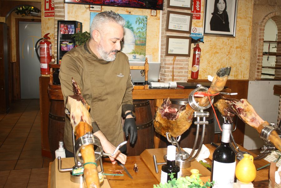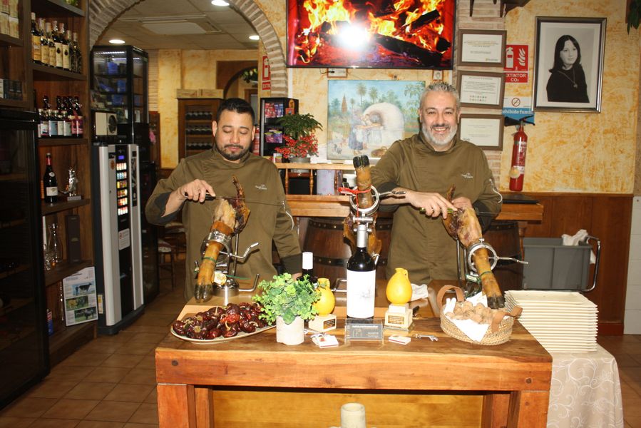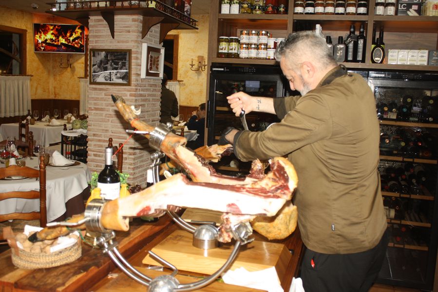El equipo, uniformado en un elegante verde aceituna, se mueve con la precisión de quien conoce cada rincón de un hogar. Mesas con manteles blancos inmaculados, sillas tradicionales de madera y enea, y una mesa central dedicada a los cortadores de jamón completan un escenario donde la tradición no es un adorno, sino una forma de estar en el mundo. Dos grandes pantallas emiten, en bucle, imágenes de brasas perfectas: una metáfora visual de que aquí el fuego no es solo una herramienta, sino un protagonista más.