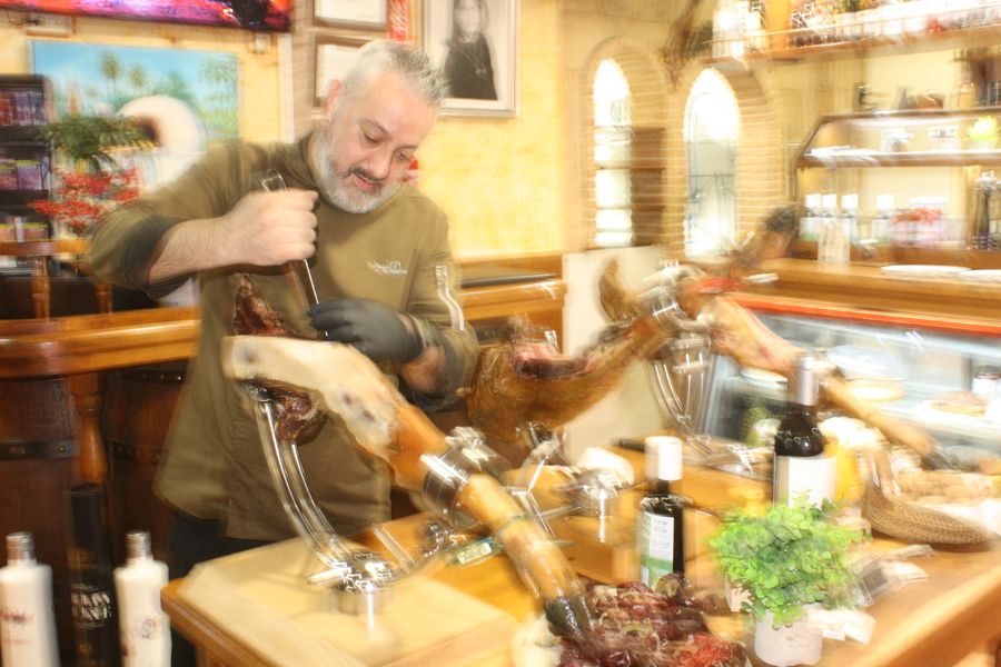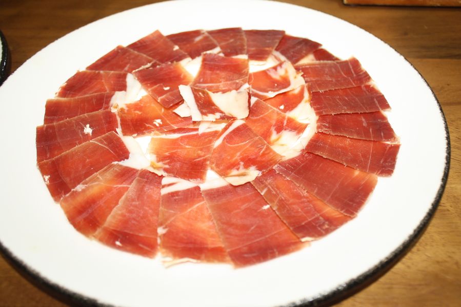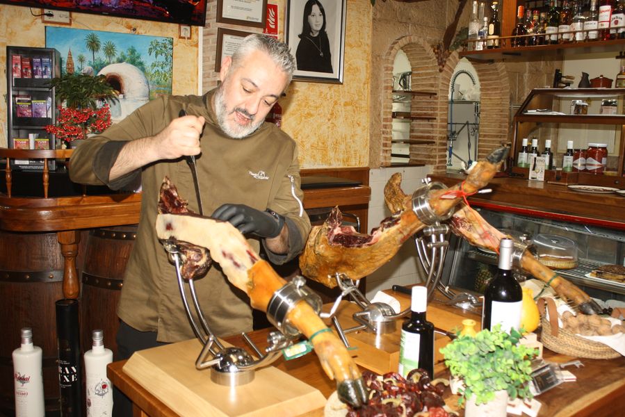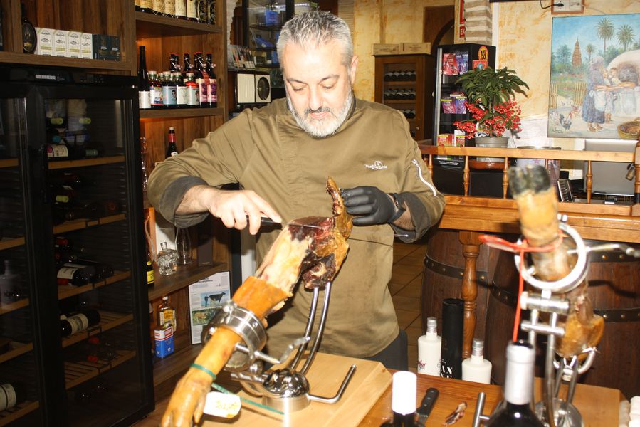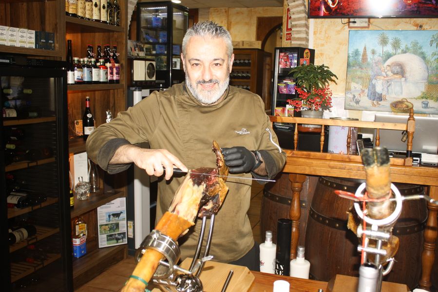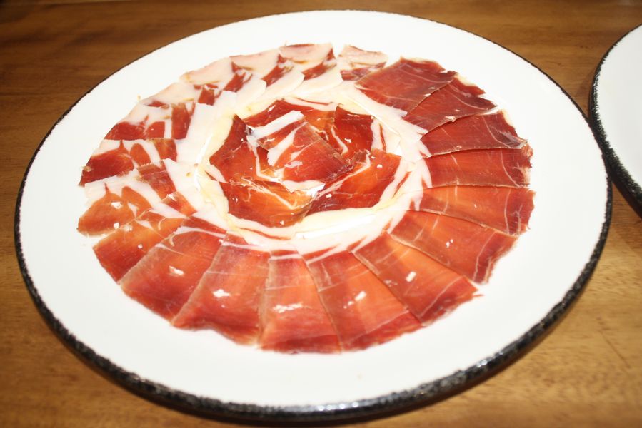 El equipo, uniformado en un elegante verde aceituna, se mueve con la precisión de quien conoce cada rincón de un hogar. Mesas con manteles blancos inmaculados, sillas tradicionales de madera y enea, y una mesa central dedicada a los cortadores de jamón completan un escenario donde la tradición no es un adorno, sino una forma de estar en el mundo. Dos grandes pantallas emiten, en bucle, imágenes de brasas perfectas: una metáfora visual de que aquí el fuego no es solo una herramienta, sino un protagonista más.