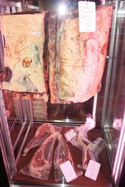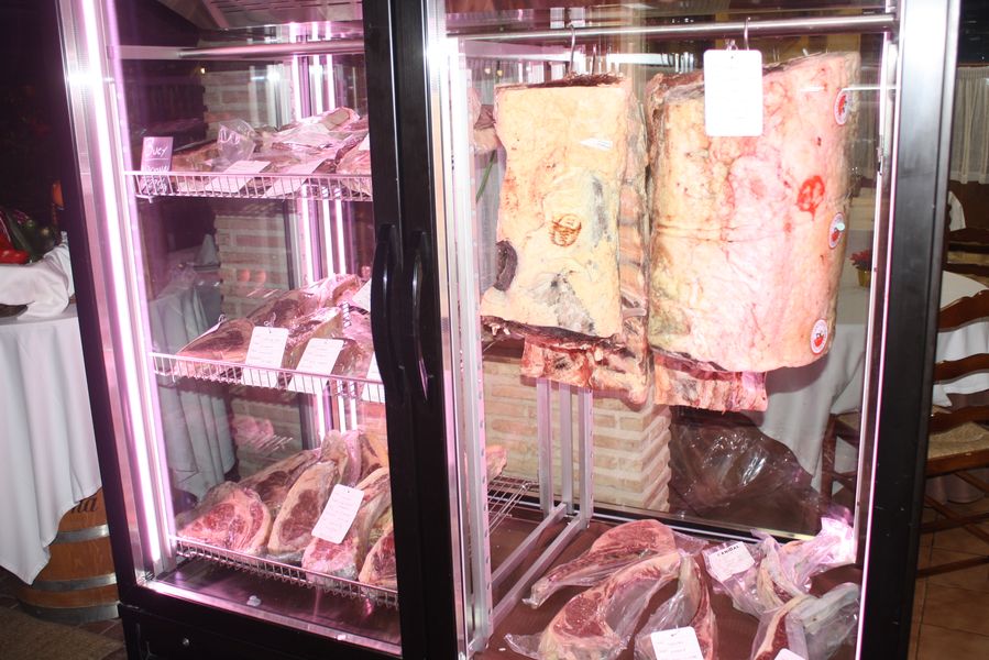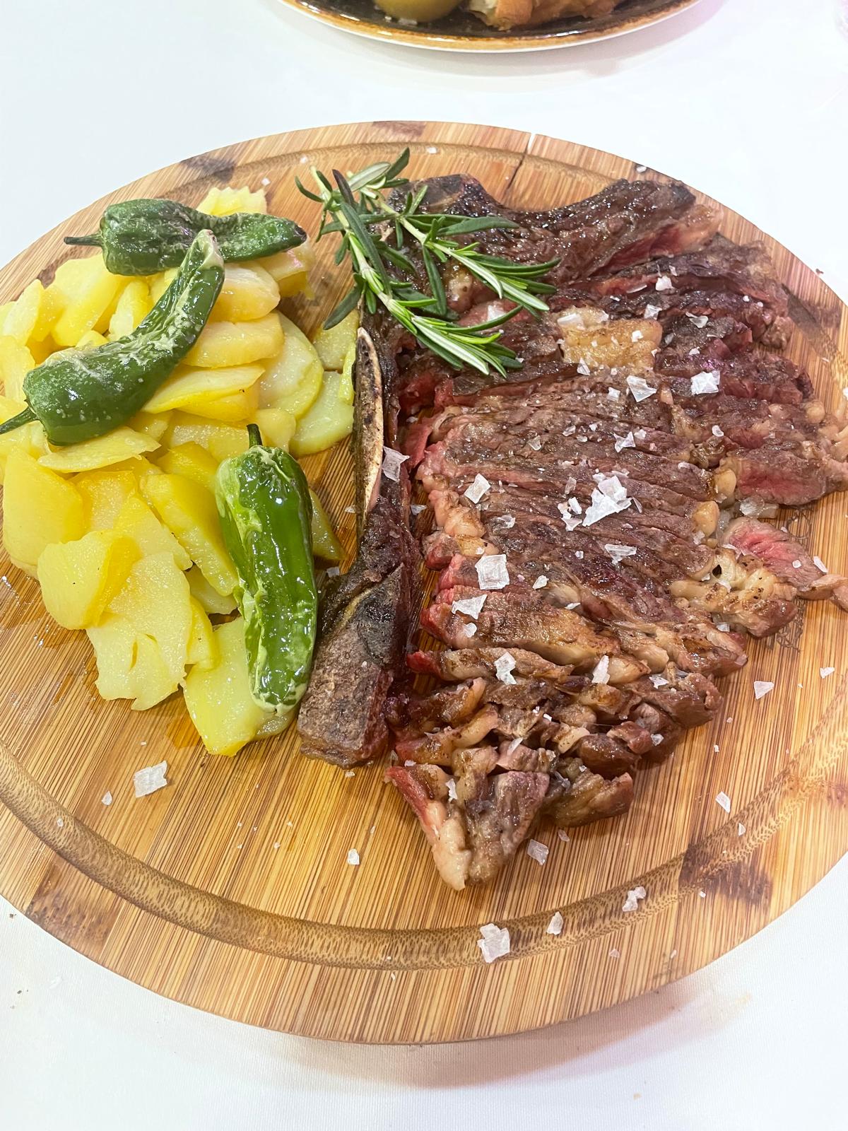 La vitrina de carnes maduradas no es solo un elemento decorativo: es la antesala de una experiencia personalizada. Tomahawk de novilla, vaca Jersey, chuletón de vaca vieja, entrecot de vacuno mayor o solomillo de vaca se cotizan según mercado y peso. Esta transparencia —»consulta precio en la vitrina o al personal»— refleja una filosofía de confianza: el comensal elige, conoce el origen y decide. No hay sorpresas, solo producto.