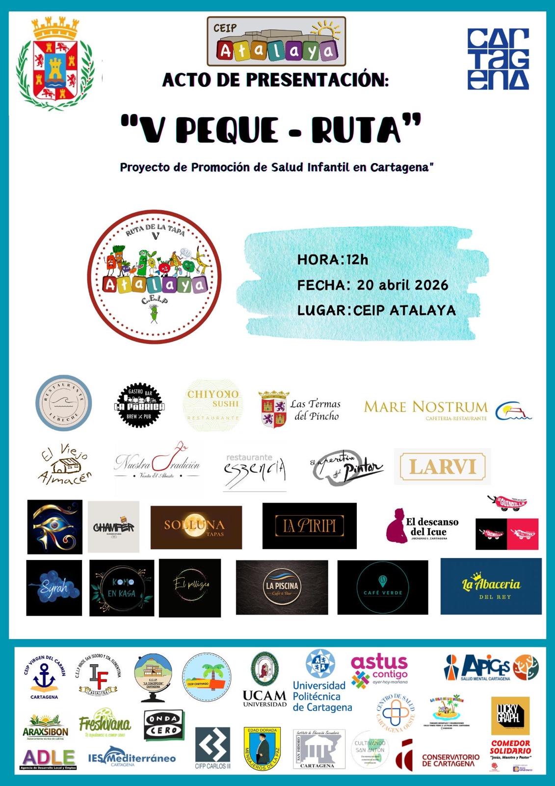 La rueda de prensa se celebrará el próximo lunes, 20 de abril, a las 12:00 horas, en el Centro de Educación Infantil y Primaria Atalaya sito en la Avda. del Cantón, s/n, 30205, de Cartagena (junto al Palacio de los Deportes). En la misma intervendrá la dirección del centro educativo, que explicará los detalles de la V edición de la ‘Peque-Ruta’.