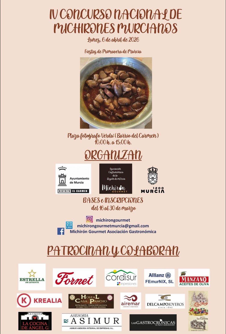 La Región de Murcia vuelve a poner en el mapa su seña de identidad culinaria con la celebración del IV Concurso Nacional de Michirones Murcianos, un certamen que convertirá la Plaza Fotógrafo Verdú en el epicentro de la gastronomía huertana el próximo lunes 6 de abril de 2026. Organizado por la Asociación Gastronómica Michirón Gourmet, en colaboración con el Ayuntamiento de Murcia y la Junta Municipal del Barrio del Carmen, el evento se enmarca dentro de las actividades de las Fiestas de Primavera y promete reivindicar, una vez más, la excelencia de un plato que trasciende fronteras.