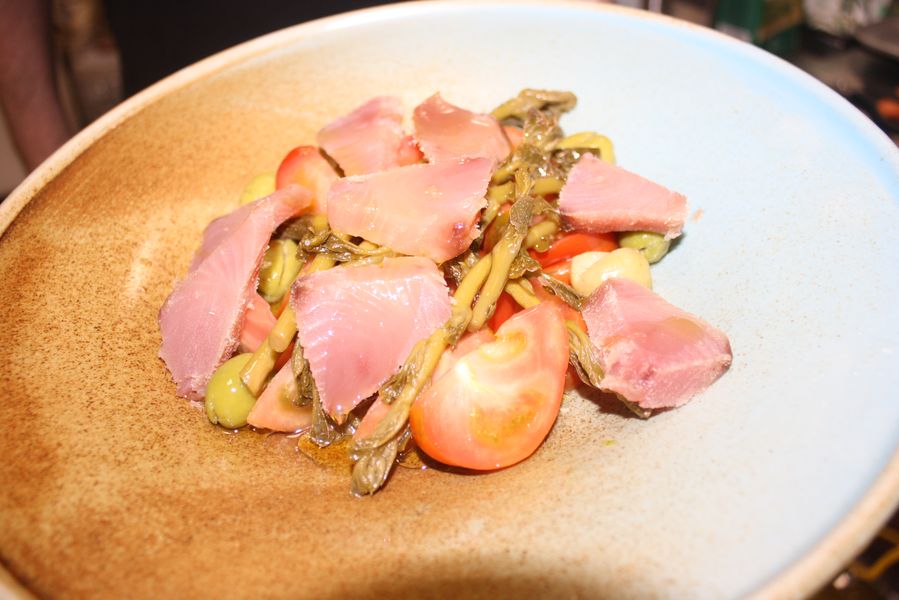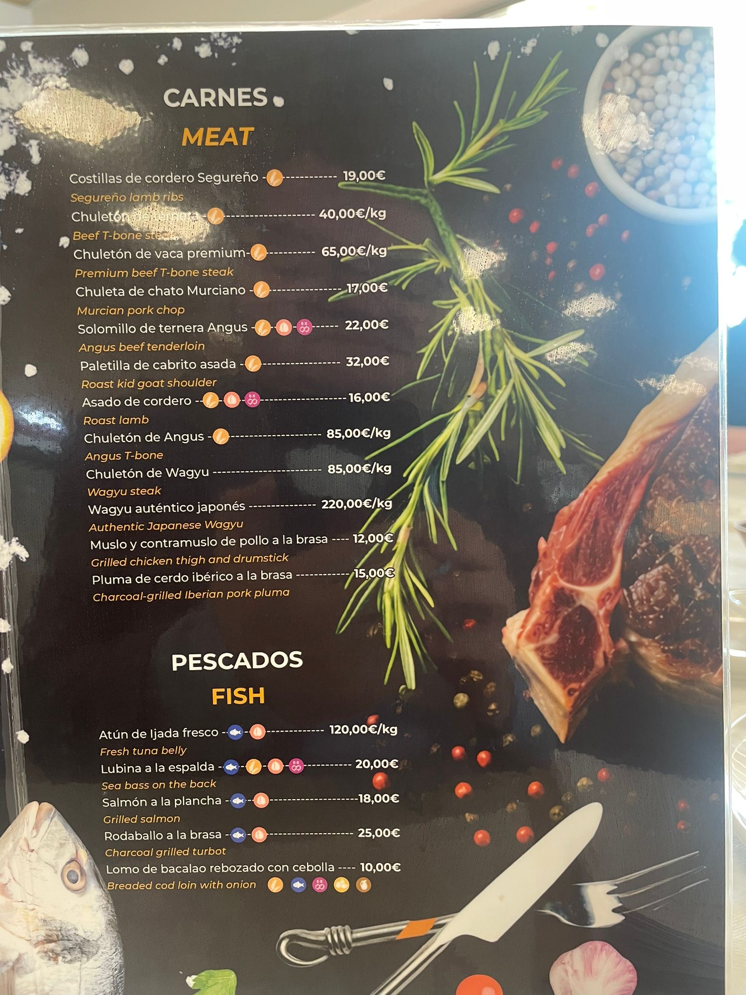El mar cercano inspira una selección de pescados tratados con respeto y técnica. Destaca el atún de ijada fresco (120€/kg), una pieza de lujo para exigentes. Le acompañan la lubina a la espalda (20€), el salmón a la plancha (18€), el rodaballo a la brasa (25€) y el lomo de bacalao rebozado con cebolla (10€), un clásico reinventado. Cada preparación busca realzar el sabor natural del producto, sin artificios, solo fuego, sal y maestría.