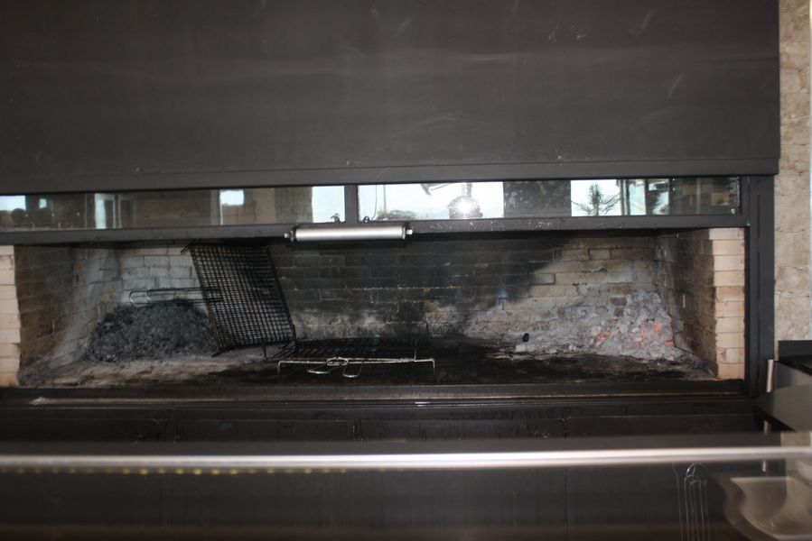 Al cruzar el umbral, el visitante es recibido por una atmósfera cálida, casi doméstica a pesar de la escala monumental. Mesas y sillas de madera noble, vestidas con manteles de papel color granate —un guiño práctico y elegante a la esencia de la cocina de brasas—, invitan a quedarse.