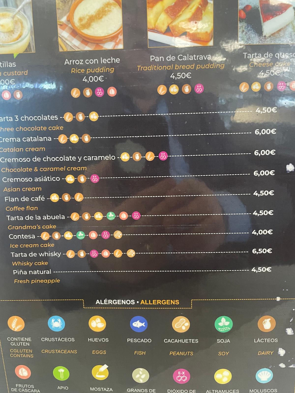 La dulzura llega con propuestas que equilibran tradición y creatividad. Los clásicos de siempre —natillas, arroz con leche, flan de café, tarta de la abuela (todos entre 4€ y 4,50€)— conviven con elaboraciones más sofisticadas: tarta de queso, tarta de tres chocolates, crema catalana (6€), cremosos de chocolate y caramelo o asiático (6€), y una sorprendente tarta de whisky (6,50€). Para cerrar con frescura, piña natural (4,50€). Precios populares para un broche de oro accesible.