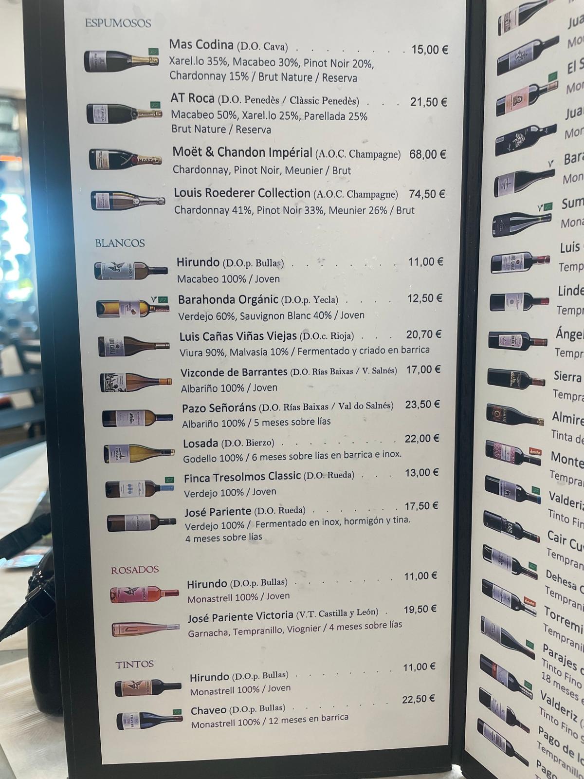 Y para celebrar, los espumosos: desde el Cava Mas Codina (15€) y el Classic Penedès AT Roca (21,50€) hasta el lujo de Moët & Chandon (68€) y Louis Roederer (74,50€).