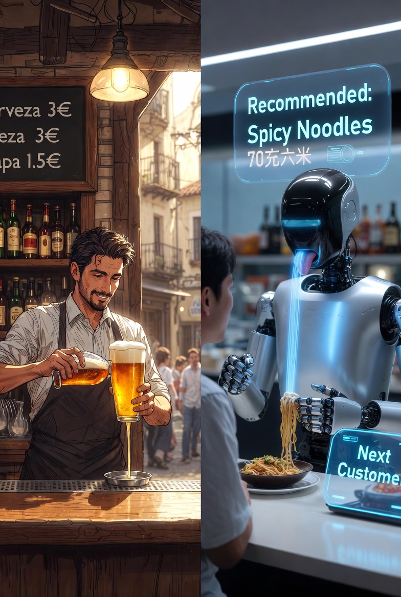 El contraste es abismal. En el aeropuerto de Madrid-Barajas, el restaurante SELF —desarrollado por la multinacional española Áreas— opera ya con inteligencia artificial gestionando pedidos, cocina y servicio sin intervención humana continua. En China, el primer restaurante robotizado de Hangzhou funciona con apenas diez autómatas que saltean, hierven fideos, preparan café por 70 céntimos y helados por 40, todo ello tras un diagnóstico facial que determina el menú ideal para cada cliente.