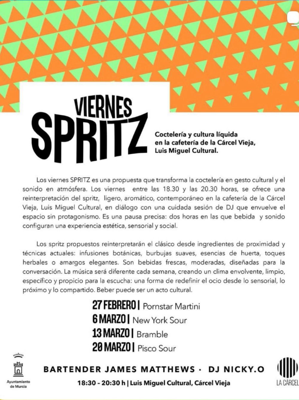 - 🗓️ Fechas destacadas: 27 feb (Pornstar Martini), 6 mar (New York Sour), 13 mar (Bramble), 20 mar (Pisco Sour).