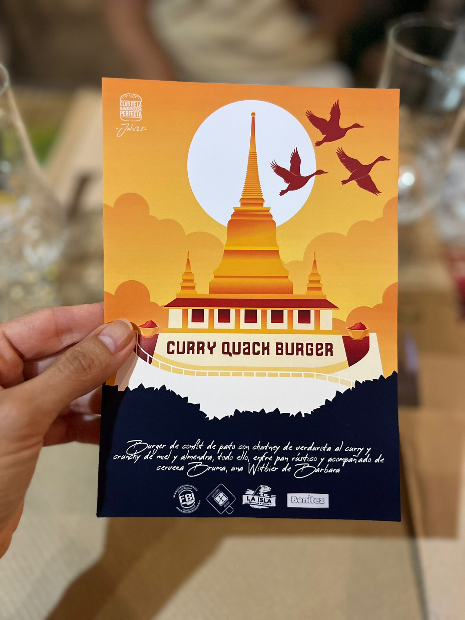 - 🍔 Hamburguesa del mes: Curry Quack Burger – Confit de pato, chutney de verdurita al curry, crunchy de miel y almendra